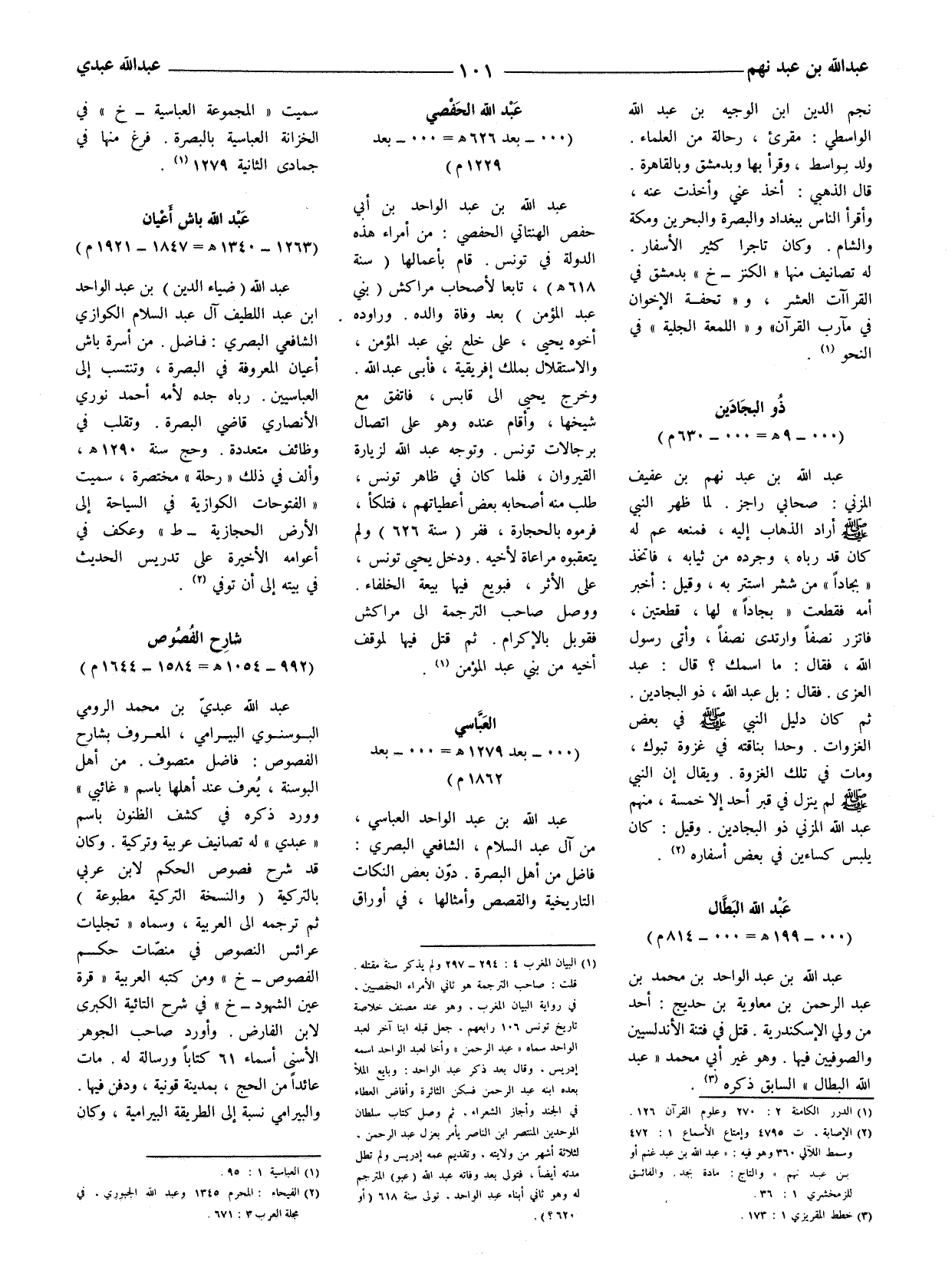 (1) البيان المغرب 4: 294 - 297 ولم يذكر سنة مقتله. قلت: صاحب الترجمة هو ثاني الأمراء الحفصصين، في رواية البيان المغرب، وهو عند مصنف خلاصة تاريخ تونس 106 رابعهم، جعل قبله ابنا آخر لعبد الواحد سماه " عبد الرحمن " وأخا لعبد الواحد اسمه إدريس، وقال بعد ذكر عبد الواحد: وبايع الملأ بعده ابنه عبد الرحمن فسكن الثائرة وأفاض العطاء الجند وأجاز الشعراء، ثم وصل كتاب سلطان الموحدين المنتظر ابن الناصر يأمر بعزل عبد الرحمن، لثلاثة أشهر من ولايته، وتقديم عمه إدريس ولم تطل مدته أيضا، فتولى بعد وفاته عبد الله (عبور) المترجم له وهو أبناء عبد الواحد، تولى سنة 618 (أو 620؟) .