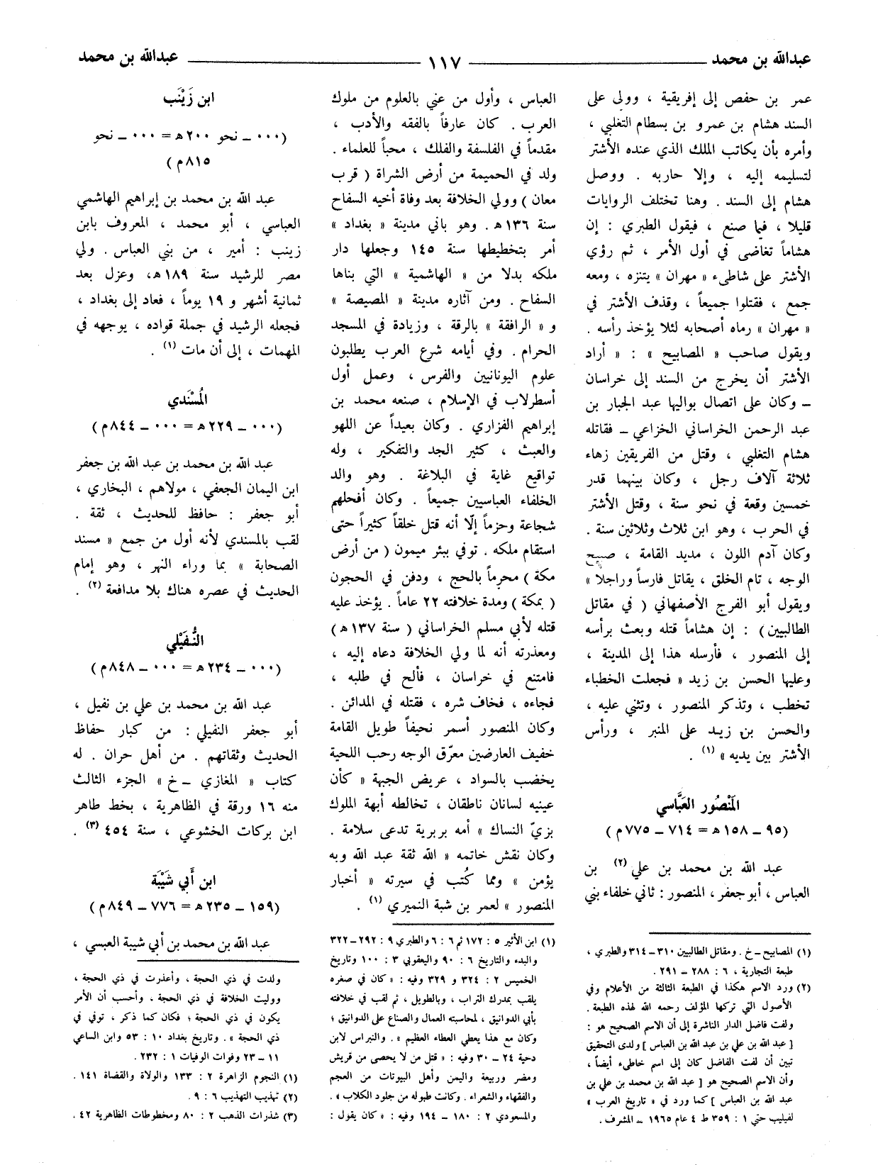 (2) ورد الاسم هكذا في الطبعة الثالثة من الأعلام وفي الأصول التي تركها المؤلف رحمه الله لهذه الطبعة. ولفت فاضل الدار الناشرة إلى أن الاسم الصحيح هو: [عبد الله بن علي بن عبد الله بن العباس] ولدى التحقيق تبين أن لفت الفاضل كان إلى اسم خاطئ أيضا، وأن الاسم الصحيح هو [عبد الله بن محمد بن علي بن عبد الله بن العباس] كما ورد في " تاريخ العرب " لفيليب حتى 1: 359 ط 4 عام 1965 - المشرف.