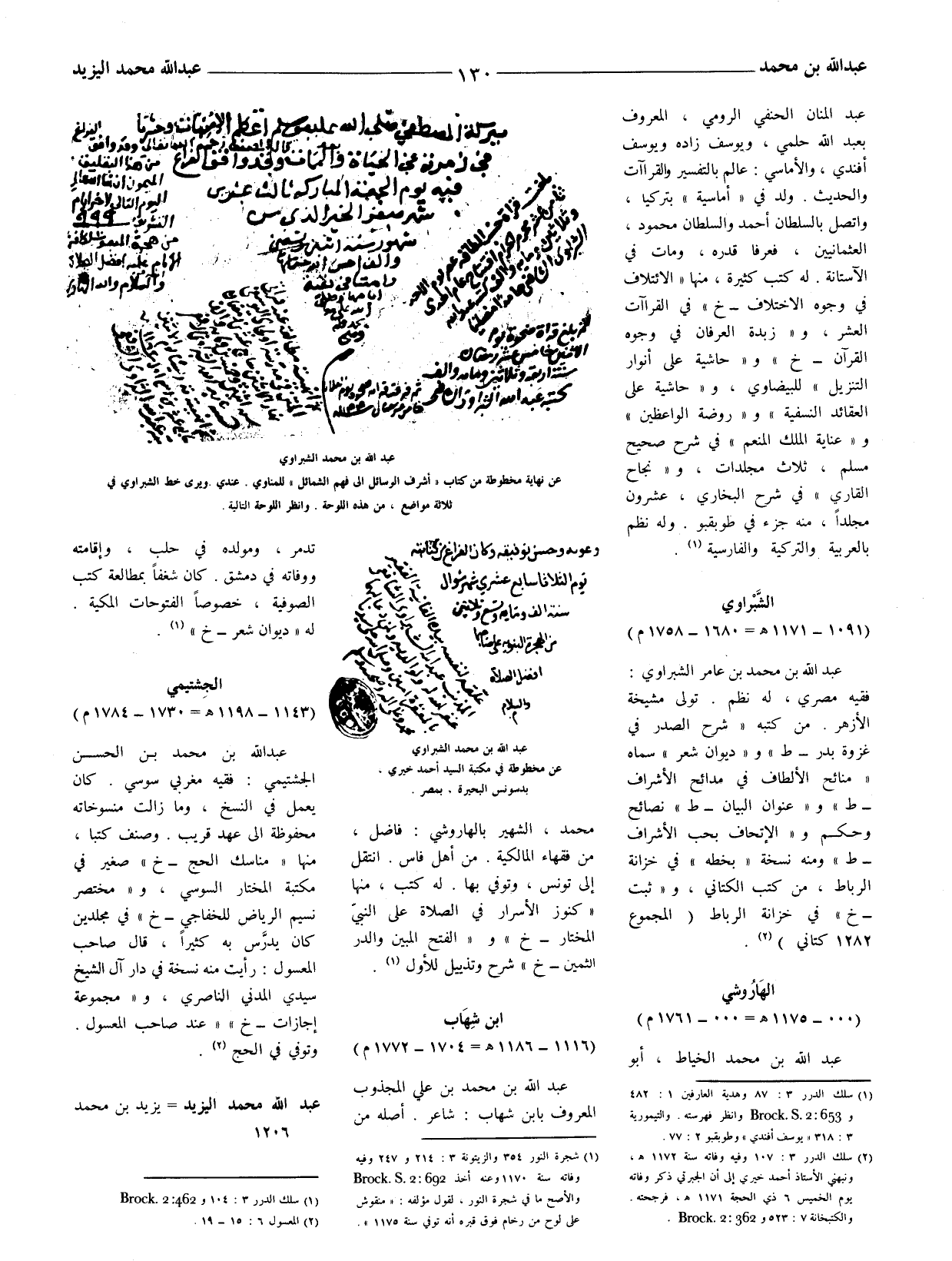 (2) سلك الدرر 3: 107 وفيه وفاته سنة 1172 هـ ونبهني الأستاذ أحمد خيري إلى أن الجبرتي ذكر وفاته يوم الخميس 6 ذي الحجة 1171 هـ فرجحته. والكتبخانة 7: 523 و Brock 2: 362