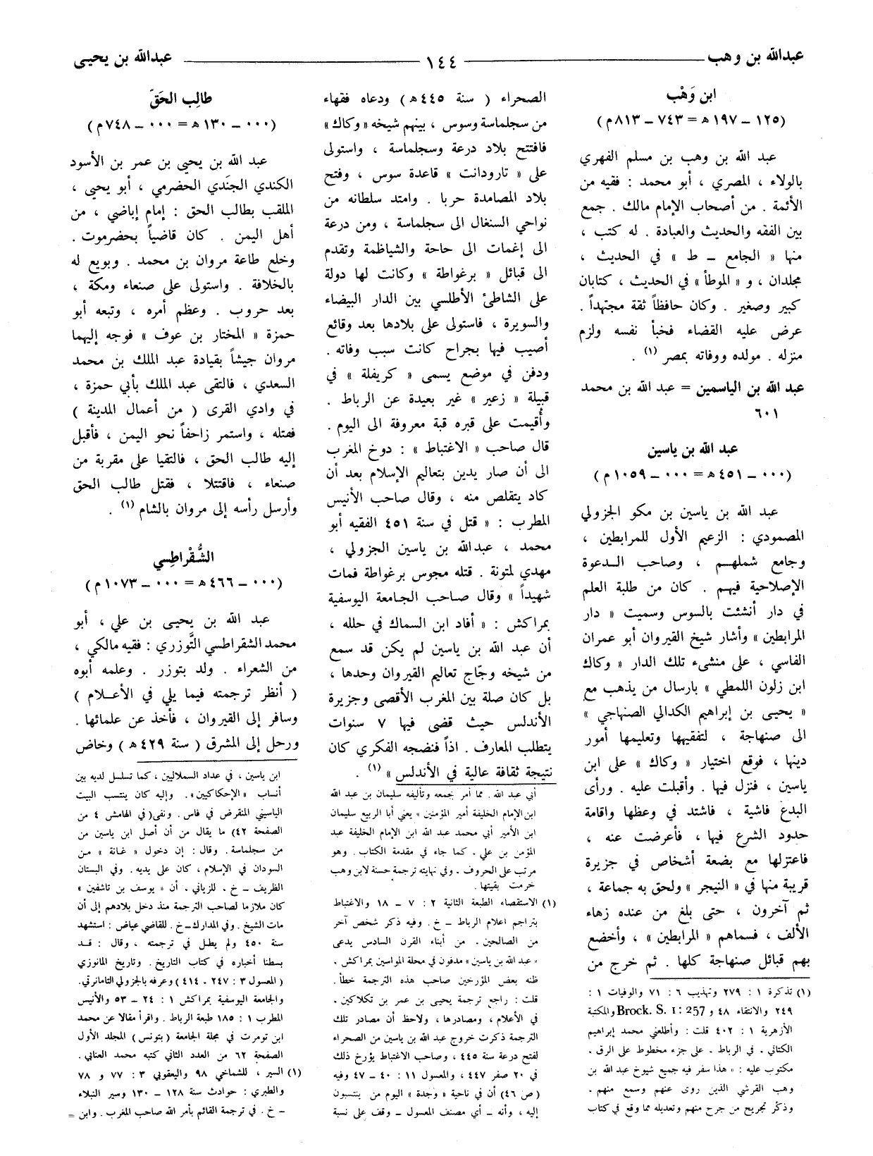 (1) تذكرة 1: 279 وتهذيب 6: 71 والوفيات 1: 249 والانتقاء 48 وBrock S I: 257. والمكتبة الأزهرية 1: 402 قلت: وأطلعني محمد إبراهيم الكتاني، في الرباط، على جزء مخطوط على الرق، مكتوب عليه: " هذا سفر فيه جميع شيوخ عبد الله بن وهب القرشي الذين روى عنهم وسمع منهم، وذكر تجريح من جرح منهم وتعديله مما وقع في كتاب