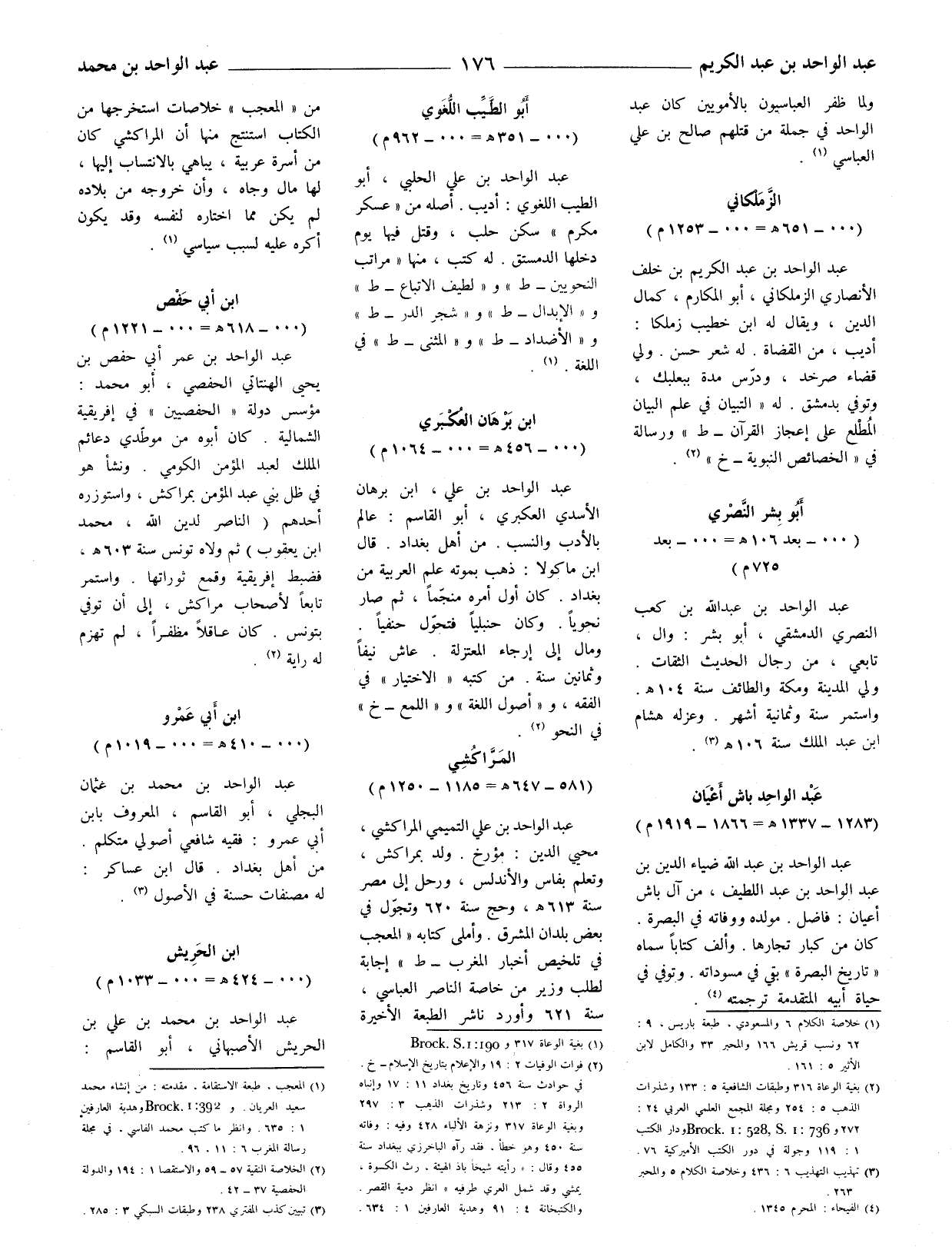 عبد الواحد بن علي التميمي المراكشي، محيي الدين: مؤرخ. ولد بمراكش، وتعلم بفاس والأندلس، ورحل إلى مصر سنة 613 هـ وحج سنة 620 وتجوّل في بعض بلدان المشرق.