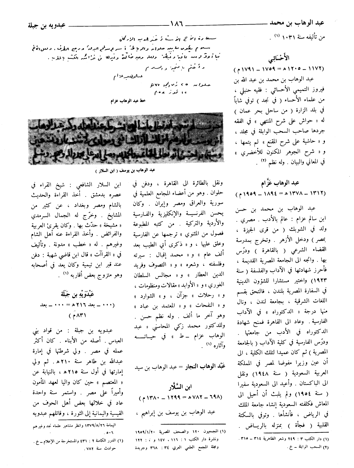 عبد الوهاب بن محمد بن حسن ابن سالم عزام: عالم بالأدب. مصري. ولد في الشوبك (من قرى الجيزة، بمصر) ودخل الأزهر. وتخرج بمدرسة القضاء الشرعي (بالقاهرة) ودرّس بها. واتجه الى الجامعة المصرية القديمة، فأحرز شهادتها في الآداب والفلسفة (سنة 1923) واختير مستشارا للشؤون الدينية في السفارة المصرية بلندن، فالتحق بقسم اللغات الشرقية، بجامعة لندن، ونال منها درجة " الدكتوراه " في الآداب الفارسية. وعاد إلى القاهرة فمنح شهادة الدكتوراه في الأدب من جامعتها. ودرّس الفارسية في كلية الآداب (بالجمامعة المصرية) ثم كان عميدا لتلك الكلية، إلى أن عين وزيراُ مفوضا لمصر في المملكة العربية السعودية (سنة 1948) ونقل الى الباكستان. وأعيد الى السعودية سفيرا (سنة 1954) ولم يلبث أن أحيل إلى المعاش فكلفته السعودية إنشاء جامعة الملك في الرياض، فأنشأها. وتوفي بالسكتة القلبية (فجأة) بمنزله بالرياض.
