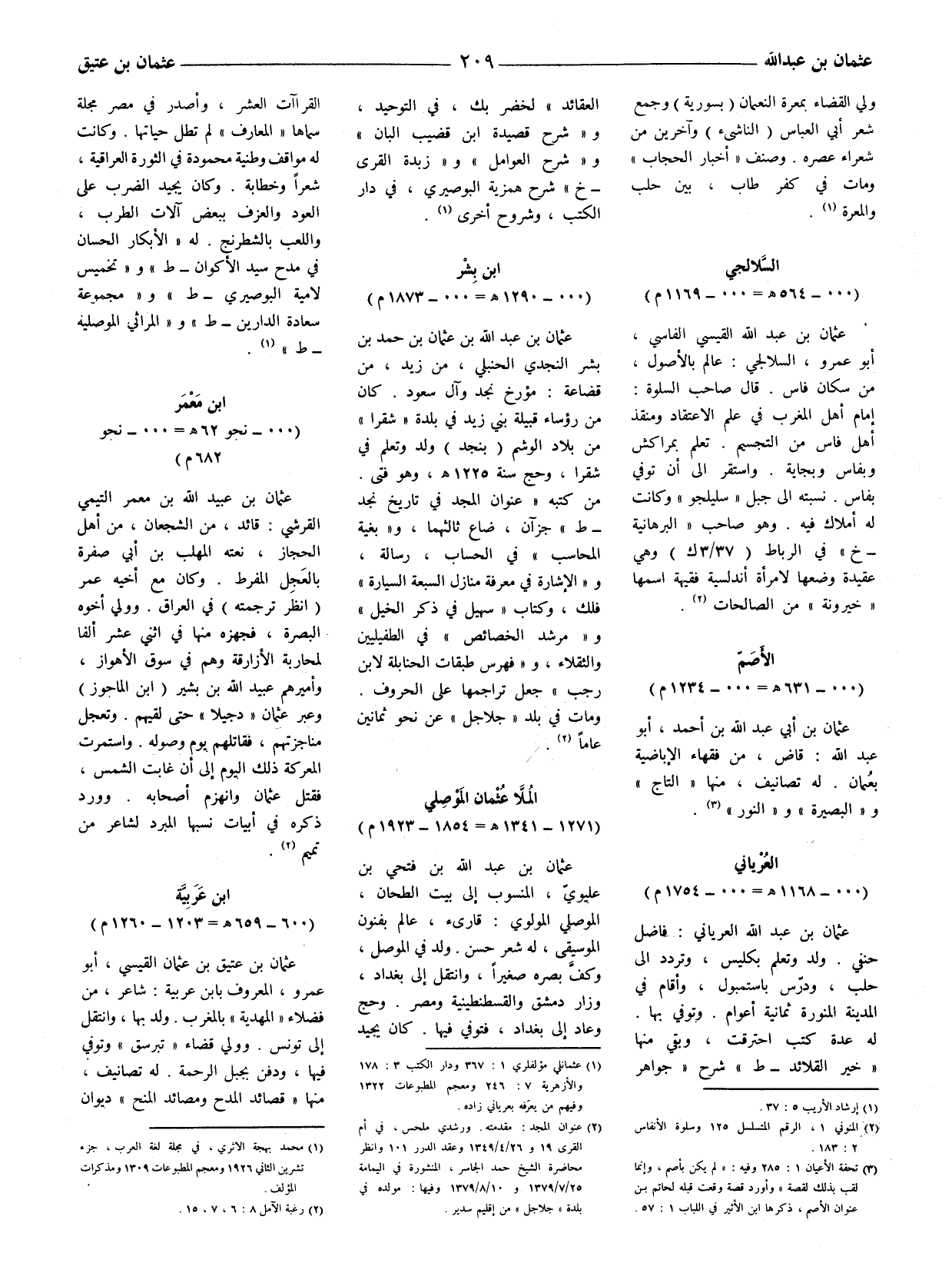 عثمان بن عبد الله بن عثمان بن حمد بن بشر النجدي الحنبلي، من زيد، من قضاعة: مؤرخ نجد وآل سعود. كان من رؤساء قبيلة بني زيد في بلدة " شقرا " من بلاد الوشم (نجد) ولد وتعلم في شقرا، وحج سنة 1225 هـ وهو فتى. من كتبه " عنوان المجد في تاريخ نجد - ط " جزآن، ضاع ثالثهما، و " بغية المحاسب " في الحساب، رسالة، و " الإشارة في معرفة منازل السبعة السيارة " فلك، وكتاب " سهيل في ذكر الخيل " و " مرشد الخصائص " في الطفيليين والثقلاء، و " فهرس طبقات الحنابلة لابن رجب " جعل تراجمها على الحروف. ومات في بلد " جلاجل " عن نحو ثمانين عاما (2) .