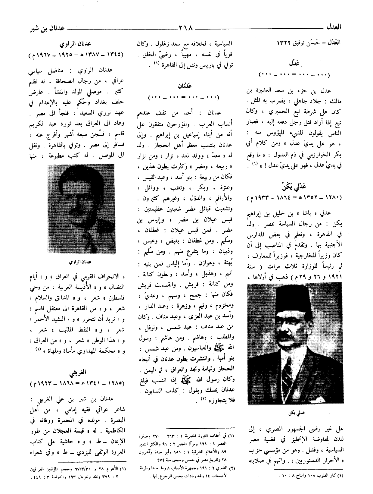 عدنان: أحد من تقف عندهم أنساب العرب. والمؤرخون متفقون على أنه من أبناء إسماعيل بن إبراهيم. وإلى عدنان ينتسب معظم أهل الحجاز. ولد له " معدّ " وولد لمعد " نزار " ومن نزار " ربيعة، ومضر " وكثرت يطون هذين، فكان من ربيعة: بنو أسد، وعبد القيس، وعنزة، وبكر، وتغلب، ووائل، والأراقم، والدؤل، وغيرهم كثيرون. وتشعبت قبائل مضر شعبتين عظيمتين: قيس عيلان بن مضر، وإلياس بن مضر. فمن قيس عيلان: غطفان، وسُليم. ومن عطفان: بغيض، عبس، وذبيانن، وما يتفرع منهم. ومن سُليم: بُهثة، وهوازن. وأما إلياس فمن بنيه: تميم، وهذيل، وأسد، وبطون كنانة، ومن كنانة: قريش. وانقسمت يقريش فكان منها: جمح، وسهم، وعديّ، ومخزوم، وتيم، وزهرة، وعبد الدار، وأسد بن عبد العزى، وعبد مناف. وكان من عبد مناف: عبد شمس، ونوفل، والمطلب، وهاشم. ومن هاشم: رسول الله صلّى الله عليه وسلم والعباسيون.