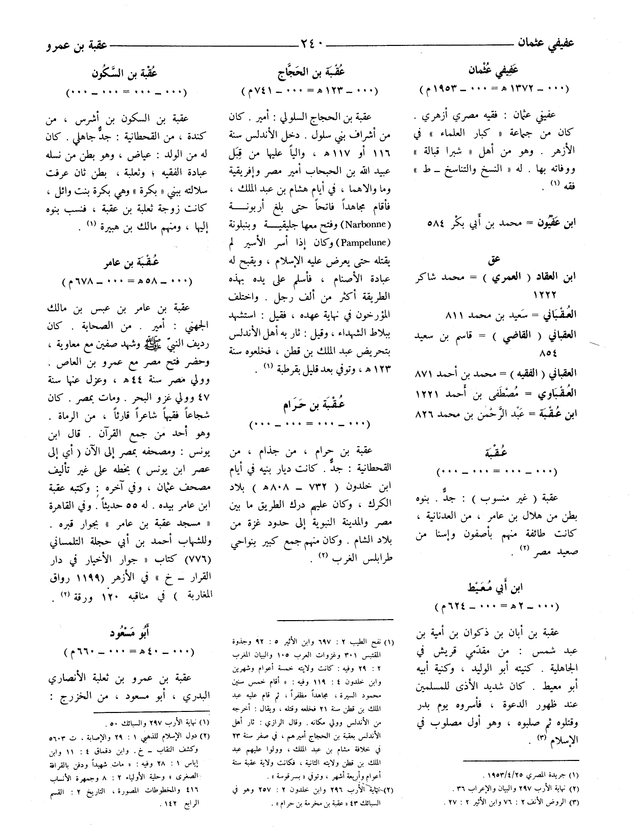 عقبة (غير منسوب) : جد، بنوه بطن من هلال بن عامر، من العدنانية، كانت طائفة منهم بأصفون وإسنا من صعيد مصر (2) .