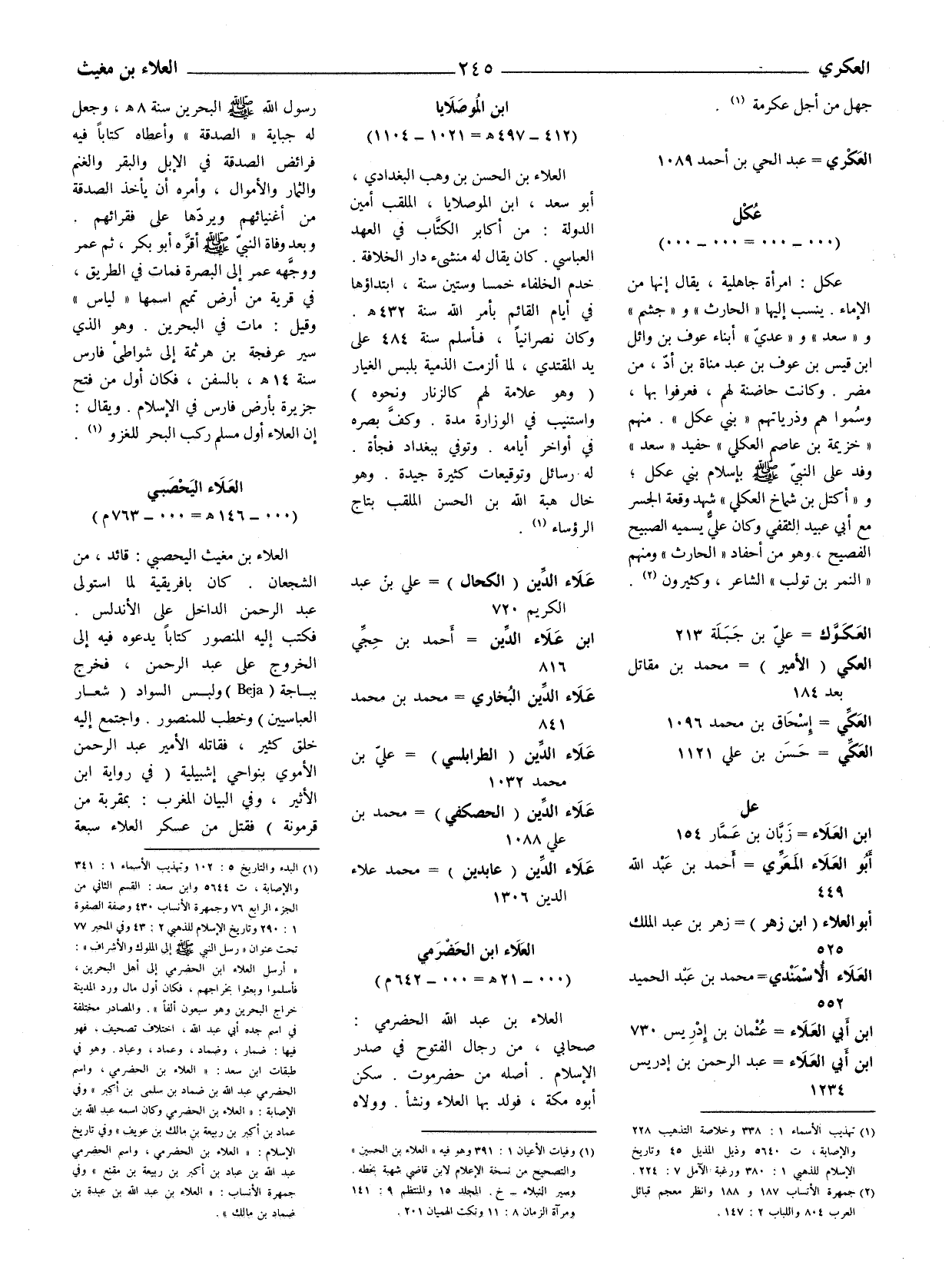 (1) البدء والتاريخ 5: 102 وتهذيب الأسماء 1: 341 والإصابة، ت 5644 وابن سعد: القسم الثاني من الجزء الرابع 76 وجمهرة الأنساب 430 وصفة الصفوة 1: 290 وتاريخ الإسلام للذهبي 2: 43 وفي المحبر 77 تحت عنوان " رسل النبي صلى الله عليه وسلم إلى الملوك والأشراف ": " أرسل العَلاَء ابن الحَضْرَمي إلى أهل البحرين، فأسلموا وبعثوا بخراجهم، فكان أول مال ورد المدينة خراج البحرين وهو سبعون ألفا ". والمصادر مختلفة في اسم جده أبي عبد الله، اختلاف تصحيف، فهو فيها: ضمار، وضماد، وعماد، وعباد. وهو في طبقات ابن سعد: " العلاء بن الحضرميّ، واسم الحَضْرَمي عبد الله بن ضماد بن سلمي بن أكبر وفي الإصابة: " العلاء بن الحضرميّ وكان اسمه عبد الله بن عماد بن أكبر بن ربيعة بن مالك بن عويف " وفي تاريخ الإسلام: " العلاء بن الحضرميّ، واسم الحَضْرَمي عبد الله بن عباد بن أكبر بن ربيعة بن مقنع " وفي جمهرة الأنساب: " العلاء بن عبد الله بن عبده بن ضماد بن مالك ".