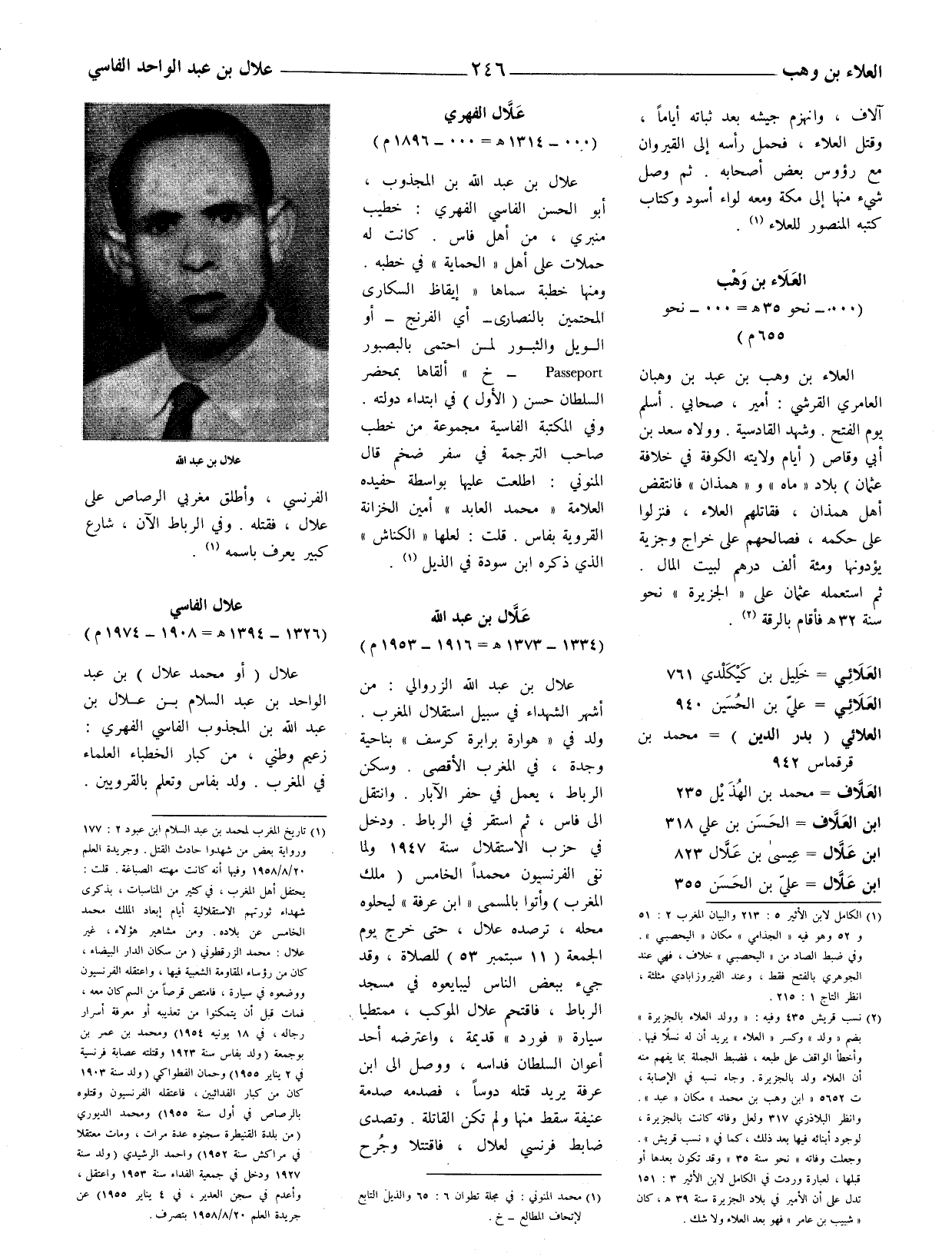 (1) تاريخ المغرب لمحمد بن عبد السلام ابن عبود 2: 177 ورواية بعض من شهدوا حادث القتل. وجريدة العلم 20 / 8 / 1958 وفيها أنه كانت مهنته الصباغة. قلت: يحتفل أهل المغرب، في كثير من المناسبات، بذكري شهداء ثورتهم الاستقلالية أيام إبعاد الملك محمد الخامس عن بلاده. ومن مشاهير هؤلاء، غير علال: محمد الزرقطوني (من سكان الدار البيضاء، كان من رؤساء المقاومة الشعبية فيها، واعتقله الفرنسيون ووضعوه في سيارة فامتص قرصا من السم كان معه، فمات قبل أن يتمكنوا من تعذيبه أو معرفة أسرار رجاله، في 18 يونيه 1954) ومحمد بن عمر بن بوجمعة (ولد بفاس سنة 1923 وقتلته عصابة فرنسية في 2 يناير 1955) وحمان الفطواكي (ولد سنة 1903 كان من كبار الفدائيين، فاعتقله الفرنسيون وقتلوه بالرصاص في أول سنة 1955) ومحمد الديوري (من بلدة القنيطرة سجنوه عدة مرات، ومات معتقلا في مراكش سنة 1952) وأحمد الرشيدي (ولد سنة 1927 ودخل في جمعية الفداء سنة 1953 واعتقل، وأعدم في سجن العدير، في 4 يناير 1955) عن جريدة العلم 20 / 8 / 1958 بتصرف.