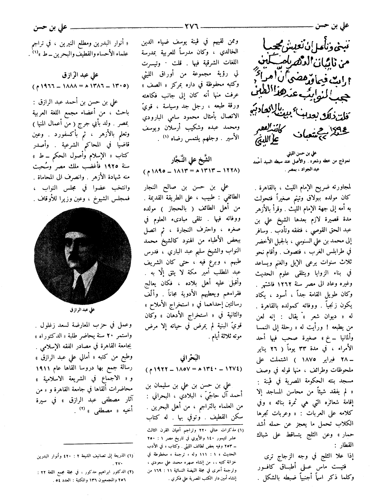 علي بن حسن بن أحمد عَبْد الرازق: باحث، من أعضاء مجمع اللغة العربية بمصر. ولد ب أبي جرج (من أعمال المنيا) وتعلم بالأزهر، ثم بأكسفورد. وأصدر كتاب " الإسلام وأصول الحكم - ط " سنة 1925 فأغضب ملك مصر وسحبت منه شهادة الأزهر. وانصرف الى المحاماة. وانتخب عضوا في مجلس النواب، فمجلس الشيوخ، وعين وزيرا للأوقاف.