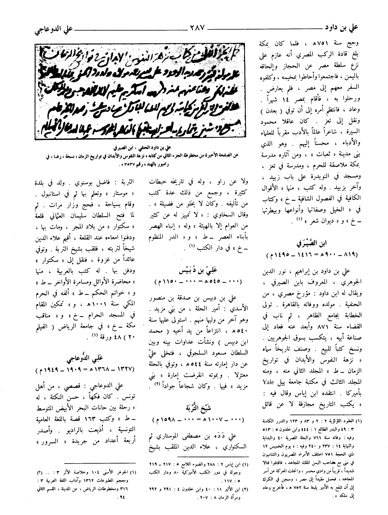[[علي بن داود الحنفي، ابن الصيرفي عن الصفحة الأخيرة من مخطوطة الجزء الثاني من كتابه " نزهة النفوس والأبدان في تواريخ الزمان " نسخة " رضا " في رامبور بالهند " رقم 3537 ".]]
