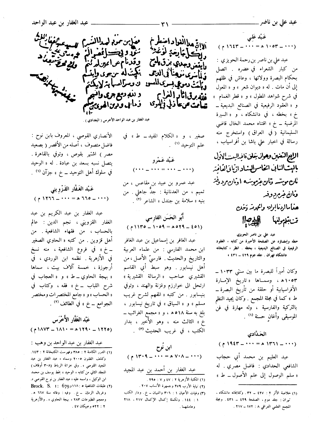 (1) الدرر الكامنة 2: 385 وفهرست الكتبخانة 2: 143. وكشف الظنون 2005 وسماه " عبد الغفّار بن عبد المجيد القوصي ". وفي خزانة الرباط (308 أوقاف) المجلد الثاني من كتابه " الوحيد " بخط يوسف بن محمد ابن الوكيل، واسمه عليه " عبد الغفّار بن نوح القوصي ".