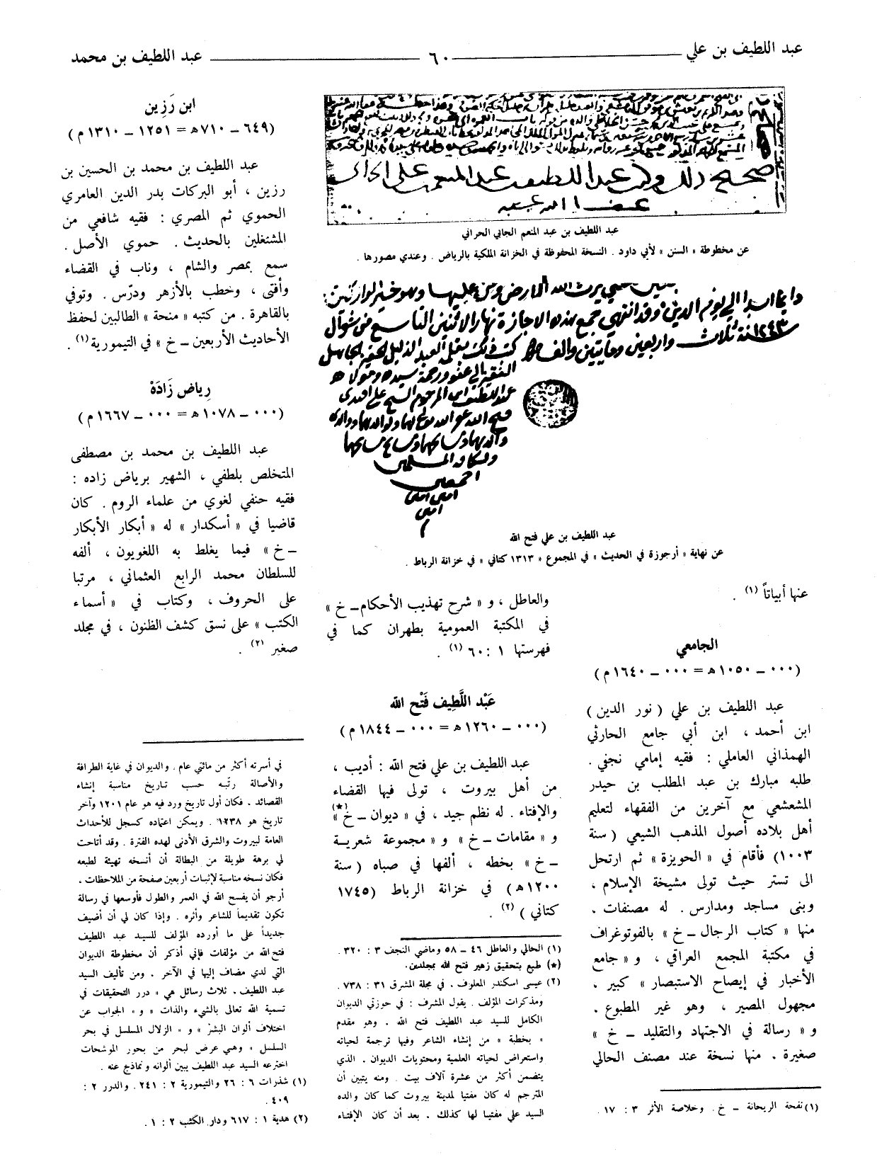 عبد اللطيف بن علي (نور الدين) ابن أحمد، ابن أبي جامع الحارثي الهمذاني العاملي، فقيه إمامي نجفي. طلبه مبارك بن عبد المطلب بن حيدر المشعشعي مع آخرين من الفقهاء لتعليم أهل بلاده أصول المذهب الشيعي (سنة 1003) فأقام في " الحويزة " ثم ارتحل الى تستر حيث تولى مشيخة الإسلام، وبنى مساجد ومدارس. له مصنفات، منها " كتاب الرجال - خ " بالفوتو غراف في مكتبة المجمع العراقي، و " جامع الاخبار في أيصاح الاستبصار " كبير، مجهول المصير، وهو غير المطبوع، و " رسالة في الاجتهاد والتقليد - خ " صغيرة، منها نسخة عند مصنف الحالي