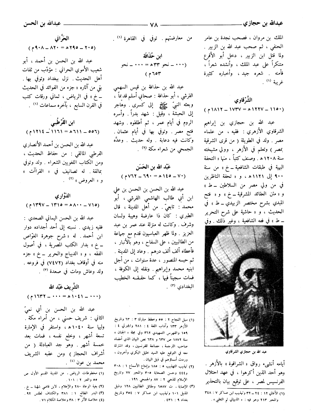 عبد الله بن حجازي بن إبراهيم الشرقاوي الأزهري: فقيه، من علماء مصر. ولد في الطويلة (من قرى الشرقية بمصر) وتعلم في الأزهر، وولي مشيخته سنة 1208 هـ وصنف كتبا، منها " التحفة البهية في طبقات الشافعية - خ " من سنة 900 إلى 1121 هـ و " تحفة الناظرين في من ولي مصر من السلاطين - ط " و " متن العقائد المشرقية - خ " و " فتح المبدي بشرح مختصر الزبيدي - ط " في الحديث، و " حاشية على شرح التحرير - ط " في فقه الشافعية، وغير ذلك.