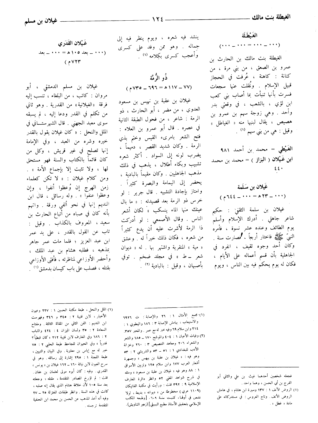 (1) الملل والنحل، طبعة مكتبة الحسين 1: 227 وعيون الأخبار، لابن قتيبة 2: 345 و 346 وفهرست ابن النديم: الفن الثاني من المقالة الثالثة. ومفتاح السعادة 2: 35 ولسان الميزان 4: 424 واللباب 2: 186 وفي المعارف لابن قتيبة 212 " كان قبطيا؟ قدريا " وفي الحيوان للجاحظ طبعة الحلبي 2: 75 خبر له مع إياس بن معاوية. وفي البيان والتبيين، طبعة اللجنة 1: 295 إشارة إلى رسائله. وهو في سرح العيون لابن نباتة 160 - 162 غيلان بن " يونس " القدري. وفيه: كان أبوه مولى لعثمان بن عفان. قلت: لم تؤرخ المصادر المتقدمة، مقتله، وجعلته بعد سنة 105 لأن خلافة هشام الّذي يقال إنه صلبه، كانت في هذه السنة. وانظر بقات المعتزلة 25 - 27 وفيه أنه أخذ المذهب عن الحسن بن محمد ابن الحنفية المتقدمة ترجمته.