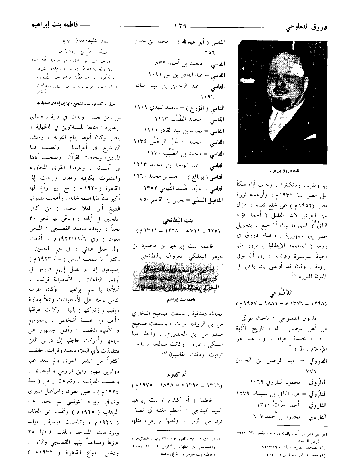 بها وبفرنسا وبانكلترة. وخلف أباه ملكا على مصر سنة 1936 م، وأرغمته ثورة مصر (1952 م) على خلع نفسه، فنزل عن العرش لابنه الطفل (أحمد فؤاد الثاني) (*) الّذي ما لبث أن خلع، بتحويل مصر إلى جمهورية. وأقام فاروق في رومة (العامة الإيطالية) يزور منها أحيانا سويسرة وفرنسة، إلى أن توفي برومة. وكان قد أوصى بأن يدفن في المدينة المنورة (1) .