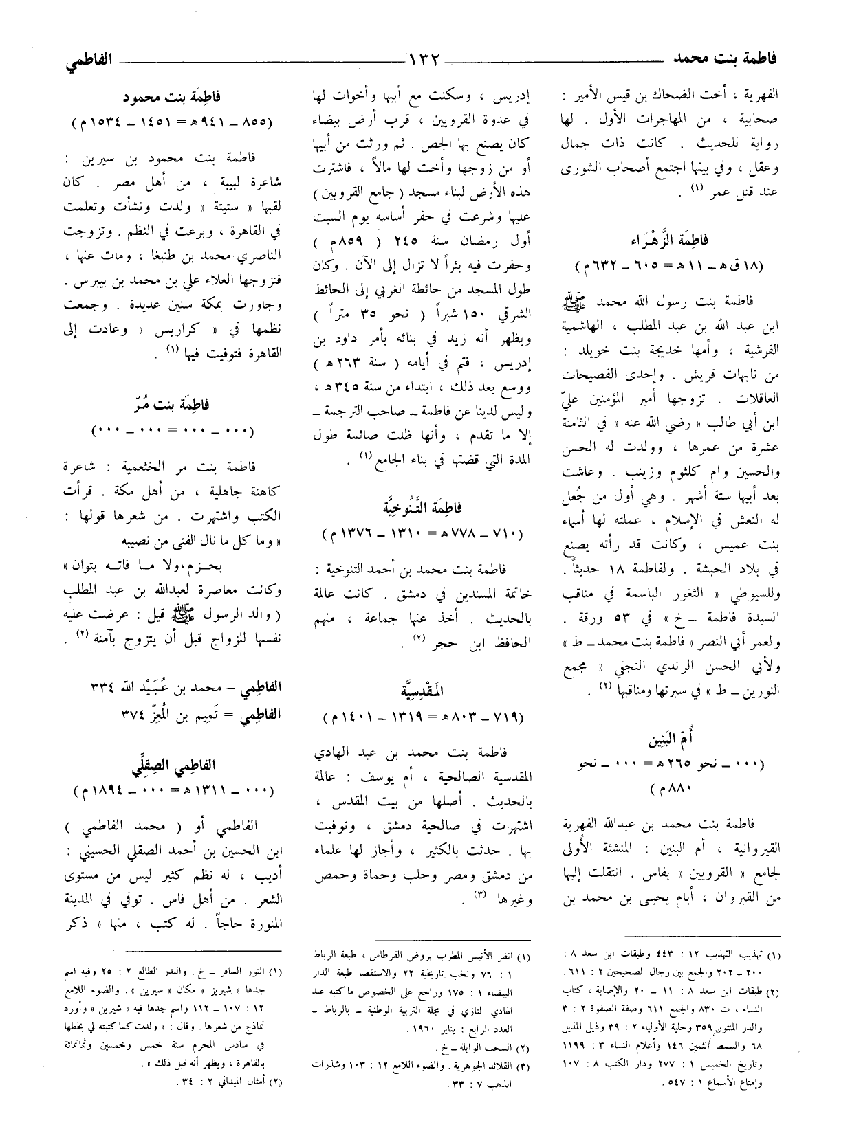 فاطمة بنت محمد بن عبد الله الفهرية القيروانية، أم البنين: المنشئة الأولى لجامع " القرويين " بفاس. انتقلت إليها من القيروان، أيام يحيى بن محمد بن