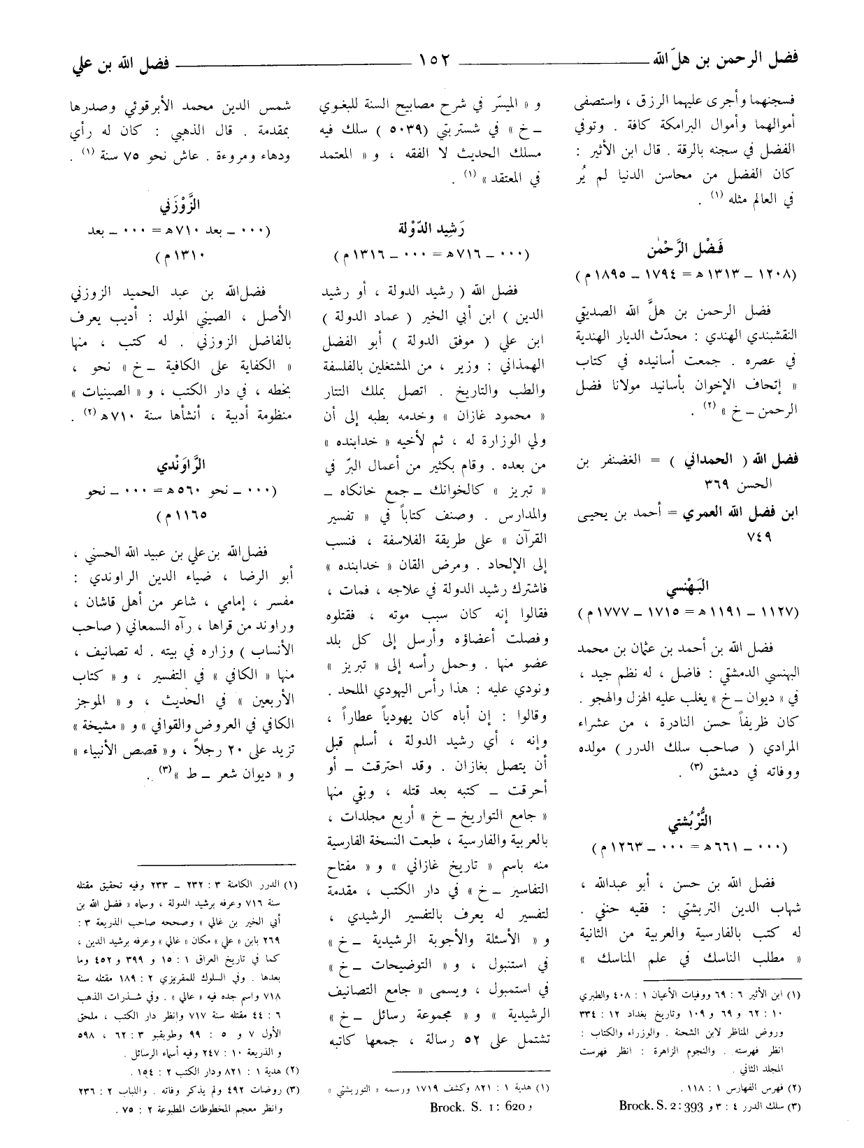 فضل الله (رشيد الدولة، أو رشيد الدين) ابن أبي الخير (عماد الدولة) ابن علي (موفق الدولة) أبو الفضل الهمذاني: وزير، من المشتغلين بالفلسفة والطب والتاريخ. اتصل بملك التتار " محمود غازان " وخدمه بطبه إلى أن ولي الوزارة له، ثم لأخيه " خدابنده " من بعده. وقام بكثير من أعمال البر في " تبريز " كالخوانك - جمع خانكاه - والمدارس. وصنف كتابا في " تفسير القرآن " علي طريقة الفلاسفة، فنسب إلى الإلحاد. ومرض القان " خدابنده " فاشترك رشيد الدولة في علاجه، فمات، فقالوا إنه كان سبب موته، فقتلوه وفصلت أعضاؤه وأرسل إلى كل بلد عضو منها. وحمل رأسه إلى " تبريز " ونودي عليه: هذا رأس اليهودي الملحد. وقالوا: إن أباه كان يهوديا عطارا، وإنه، أي رشيد الدولة، أسلم قبل أن يتصل بغازان. وقد احترقت - أو أحرقت - كتبه بعد قتله، وبقي منها " جامع التواريخ - خ " أربع مجلدات، بالعربية والفارسية، طبعت النسخة الفارسية منه باسم " تاريخ غازاني " و " مفتاح التفاسير - خ " في دار الكتب، مقدمة لتفسير له يعرف بالتفسير الرشيديّ، و " الأسئلة والأجوبة الرشيدية - خ " في استنبول، و " التوضيحات - خ " في استمبول، ويسمى " جامع التصانيف الرشيدية " و " مجموعة رسائل - خ " تشتمل على 52 رسالة، جمعها كاتبه