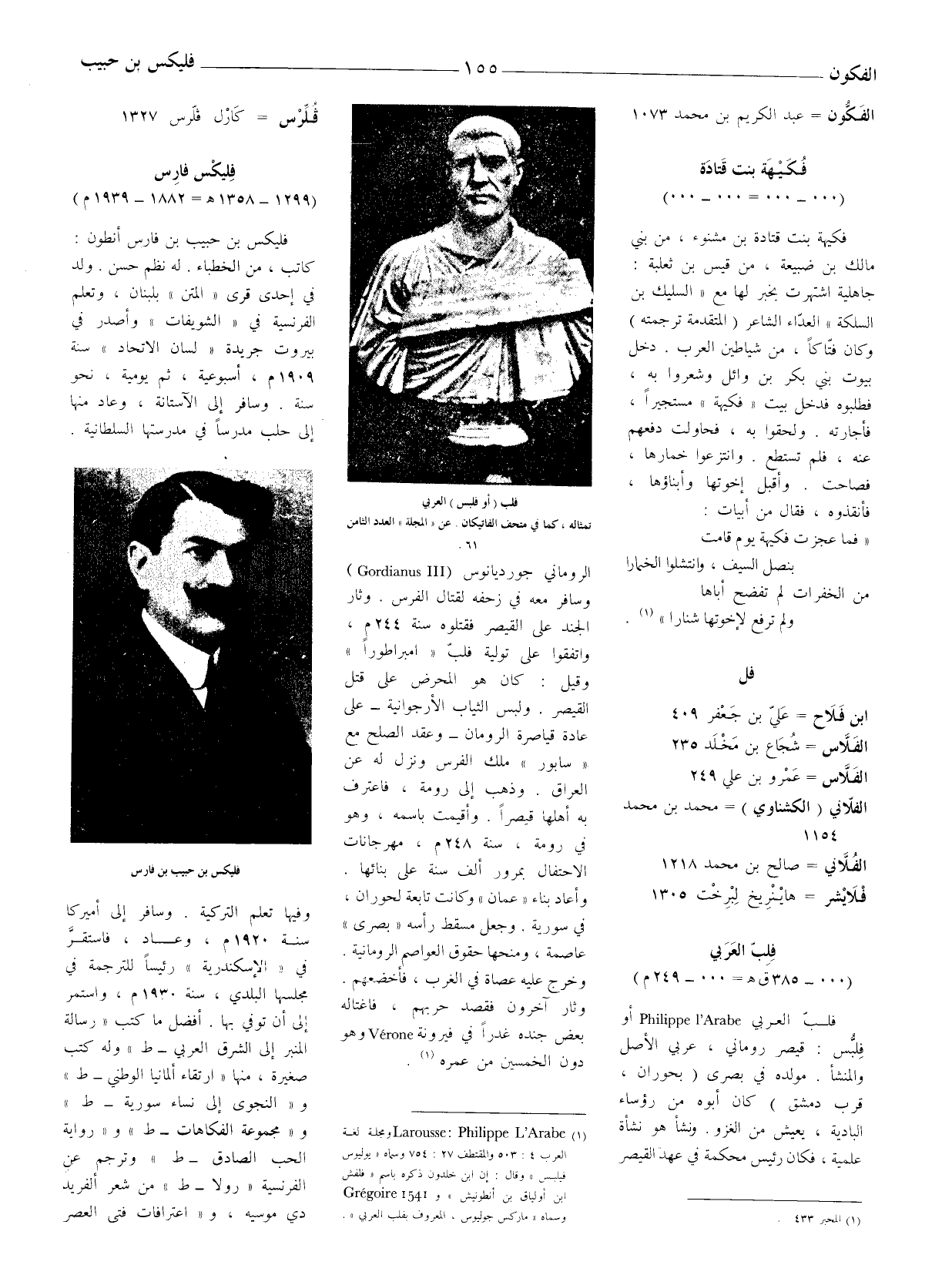 (1) Larousse: philippe LArabe ومجلة لغة العرب 4: 503 والمقتطف 27: 754 وسماه " يوليوس فيلبس " وقال: إن ابن خلدون ذكره باسم " فلفش ابن أولياق بن أنطونيش " و 1541 Gregoire وسماه " ماركس جوليوس " المعروف بفلب العربيّ ".