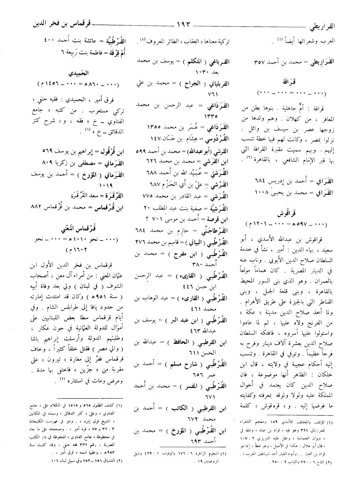 (1) كشف الظنون 565 و 1515 في الكلام على " جامع الفتاوي " وعلى " كنز الدقائق " وسماه في المكانين " الشيخ قرق إمره ". وهو في فهرست الكتبخانة 3: 32 و 75 " قره أمير ". وصححته على ما جاء في مخطوطة " جامع الفتاوى " المحفوظة في دار الكتب المصرية، رقم 332 فقه حنفي، وقد كتبت سنة 953 هـ وعليها اسمه " قرق أمير ".