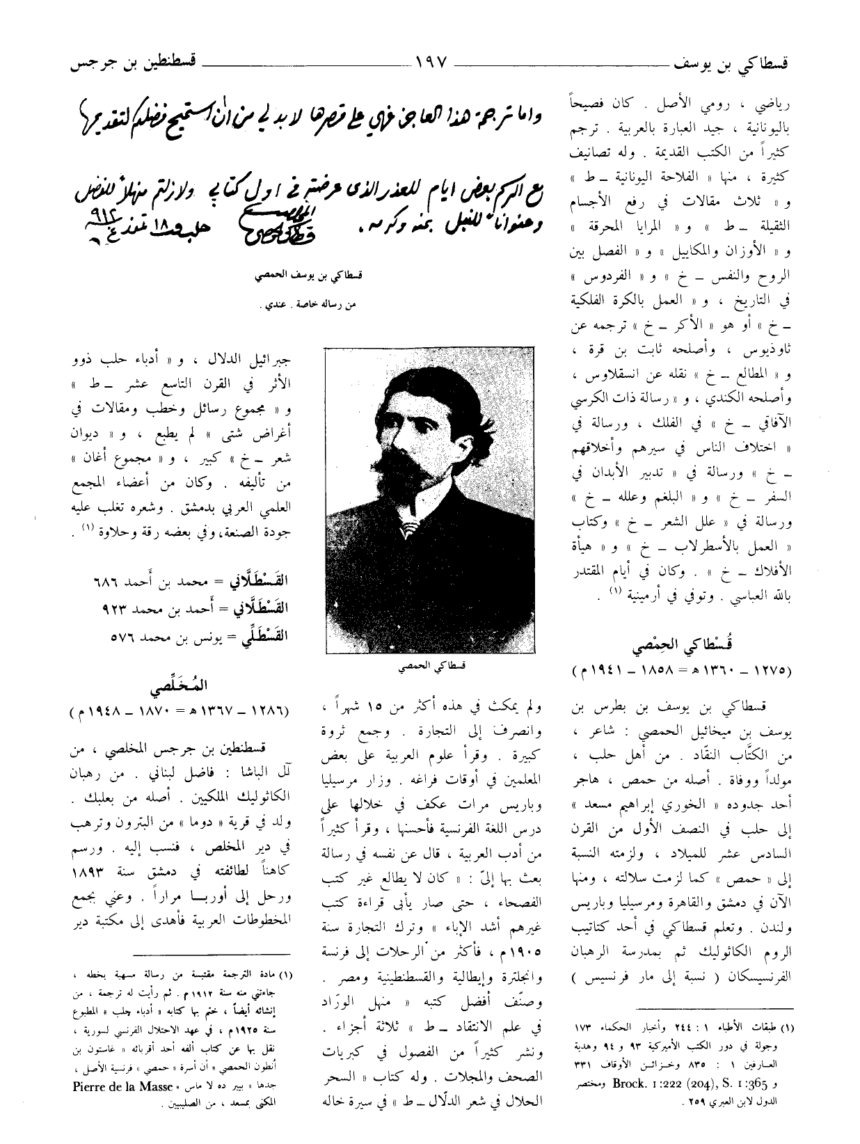 (1) مادة الترجمة مقتبسة من رسالة مسهبة بخطه، جاءتني منه سنة 1917 م. ثم رأيت له ترجمة، من إنشائه أيضا، ختم بها كتابه " أدباء حلب " المطبوع سنة 1925 م، في عهد الاحتلال الفرنسي لسورية، نقل بها عن كتاب ألفه أحد أقربائه " غاستون بن انطون الحمصي " أن أسرة " حمصي " فرنسية الأصل، جدها " بيير ده لاماس " Pierre de la Masse المكني بمسعد، من الصليبيين.
