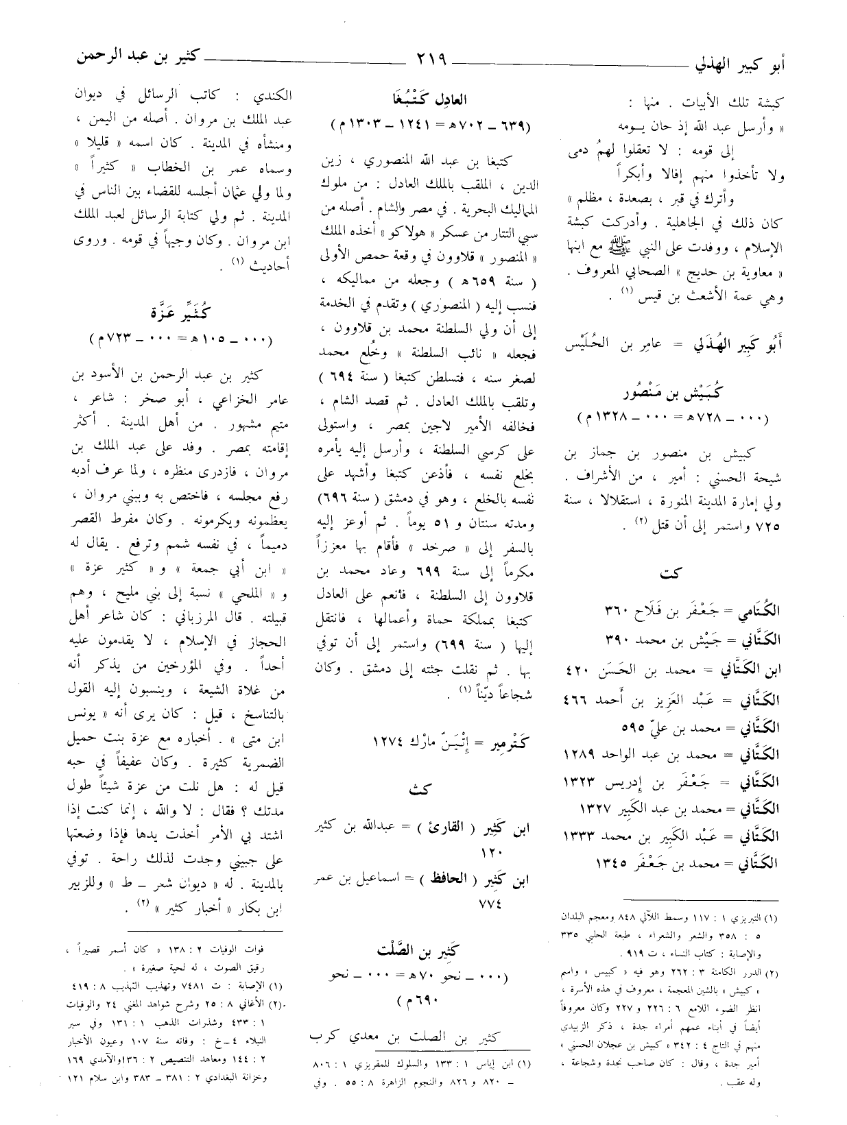 كثير بن عبد الرحمن بن الأسود بن عامر الخزاعي، أبو صخر: شاعر، متيم مشهور. من أهل المدينة. أكثر إقامته بمصر. وفد على عبد الملك بن مروان، فازدري منظره، ولما عرف أدبه رفع مجلسه، فاختص به وبيني مروان، يعظمونه ويكرمونه. وكان مفرط القصر دميما، في نفسه شمم وترفع. يقال له " ابن أبي جمعة " و " كثير عزة " و " الملحي " نسبة إلى بني مليح، وهم قبيلته، قال المرزباني: كان شاعر أهل الحجاز في الإسلام، لا يقدمون عليه أحدا. وفي المؤرخين من يذكر أنه من غلاة الشيعة، وينسبون إليه القول بالتناسخ، قيل: كان يرى أنه " يونس ابن متى " أخباره مع عزة بنت حميل الضمرية كثيرة. وكان عفيفا في حبه قيل له: هل نلت من عزة شيئا طول مدتك؟ فقال: لا والله، إنما كنت إذا اشتد بي الأمر أخذت يدها فإذا وضعتها على جبيني وجدت لذلك راحة. توفي بالمدينة. له " ديوان شعر - ط " وللزبير ابن بكار " أخبار كثير " (2) .