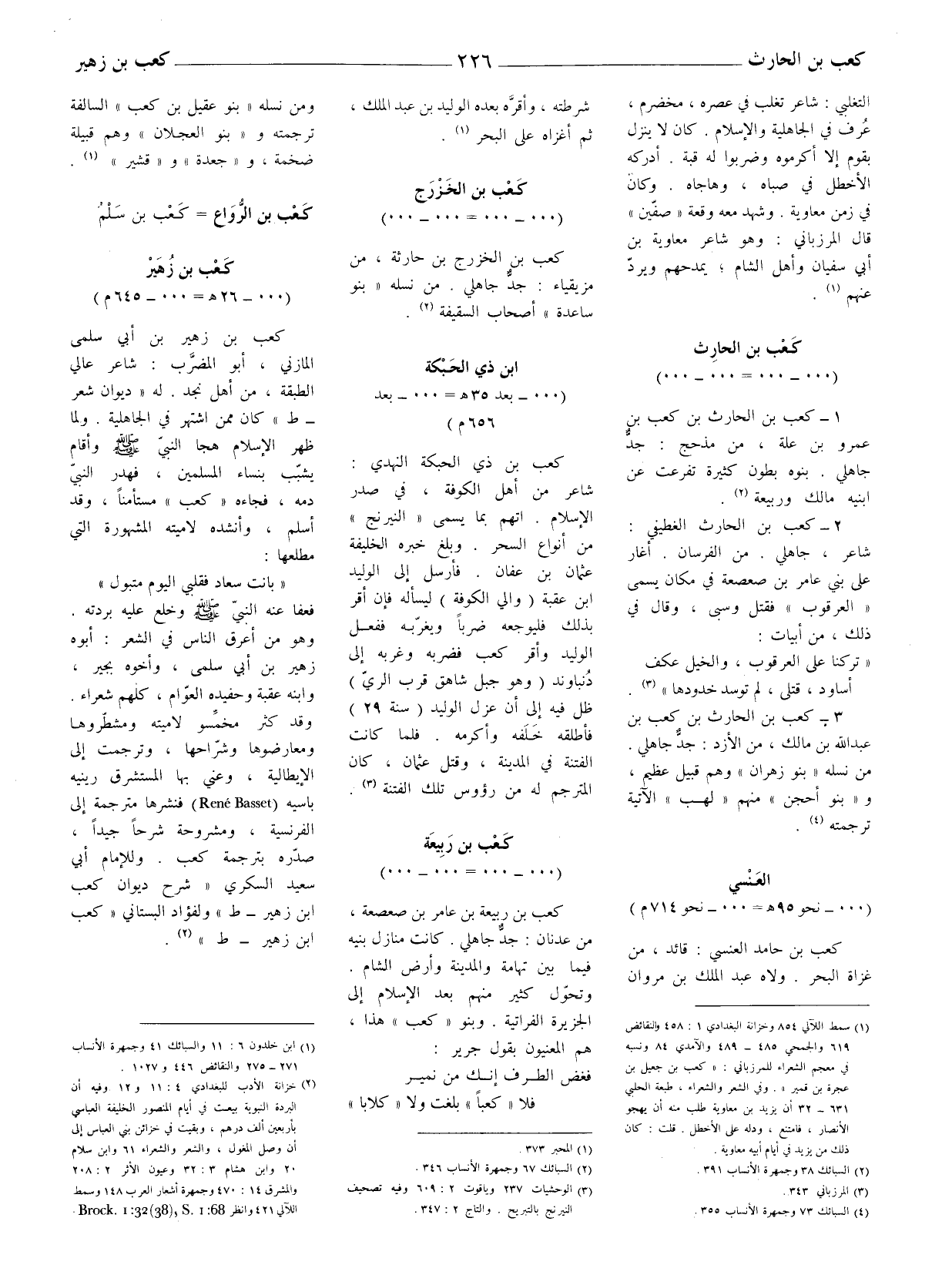 كعب بن زهير بن أبي سلمى المازني، أبو المضرّب: شاعر عالي الطبقة، من أهل نجد، له " ديوان شعر - ط " كان ممن اشتهر في الجاهلية. ولما ظهر الإسلام هجا النبي صلى الله عليه وسلّم وأقام يشبّب بنساء المسلمين، فهدر النبيّ دمه، فجاءه " كعب " مستأمنا، وقد أسلم، وأنشده لاميته المشهورة التي مطلعها: " بانت سعاد فقلبي اليوم متبول " فعفا عنه النبي صلّى الله عليه وآله وخلع عليه بردته. وهو عن أعرق الناس في الشعر: أبوه زهير بن أبي سلمى، وأخوه بجير، وابنه عقبة وحفيده العوّام، كلهم شعراء. وقد كثر مخمّسو لاميته ومشطّروها ومعارضوها وشرّاحها، وترجمت إلى الإيطالية، وعني بها المستشرق رينيه باسيه (Rene Basset) فنشرها مترجمة إلى الفرنسية، ومشروحة شرحا جيدا، صدّره بترجمة كعب. وللإمام أبي سعيد السكري " شرح ديوان كعب ابن زهير - ط " ولفؤاد البستاني " كعب ابن زهير - ط " (2) .