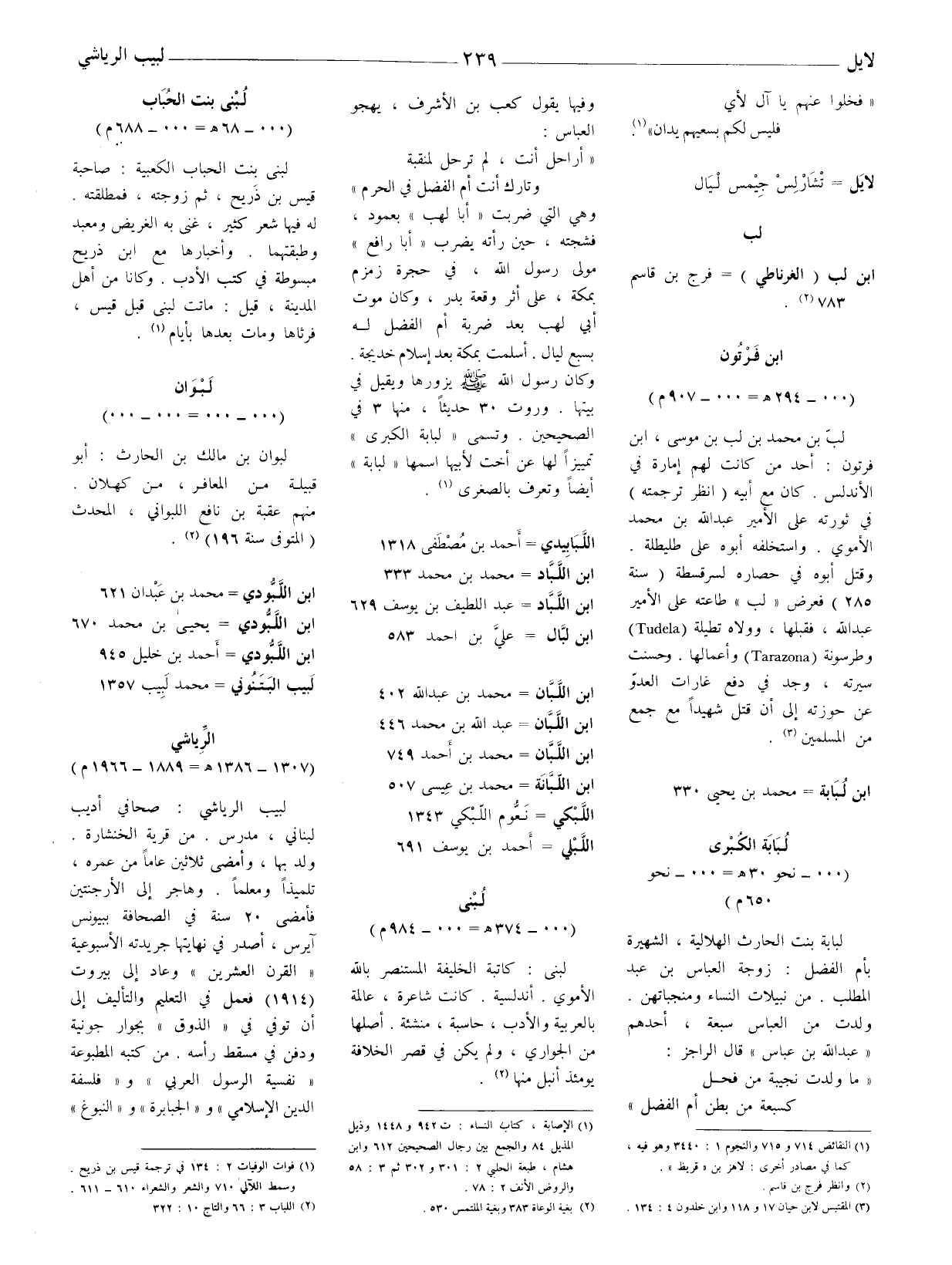 لبني: كاتبة الخليفة المستنصر باللَّه الأموي. أندلسية. كانت شاعرة، عالمة بالعربية والأدب، حاسبة، منشئة. أصلها من الجواري، ولم يكن في قصر الخلافة يومئذ أنبل منها (2)