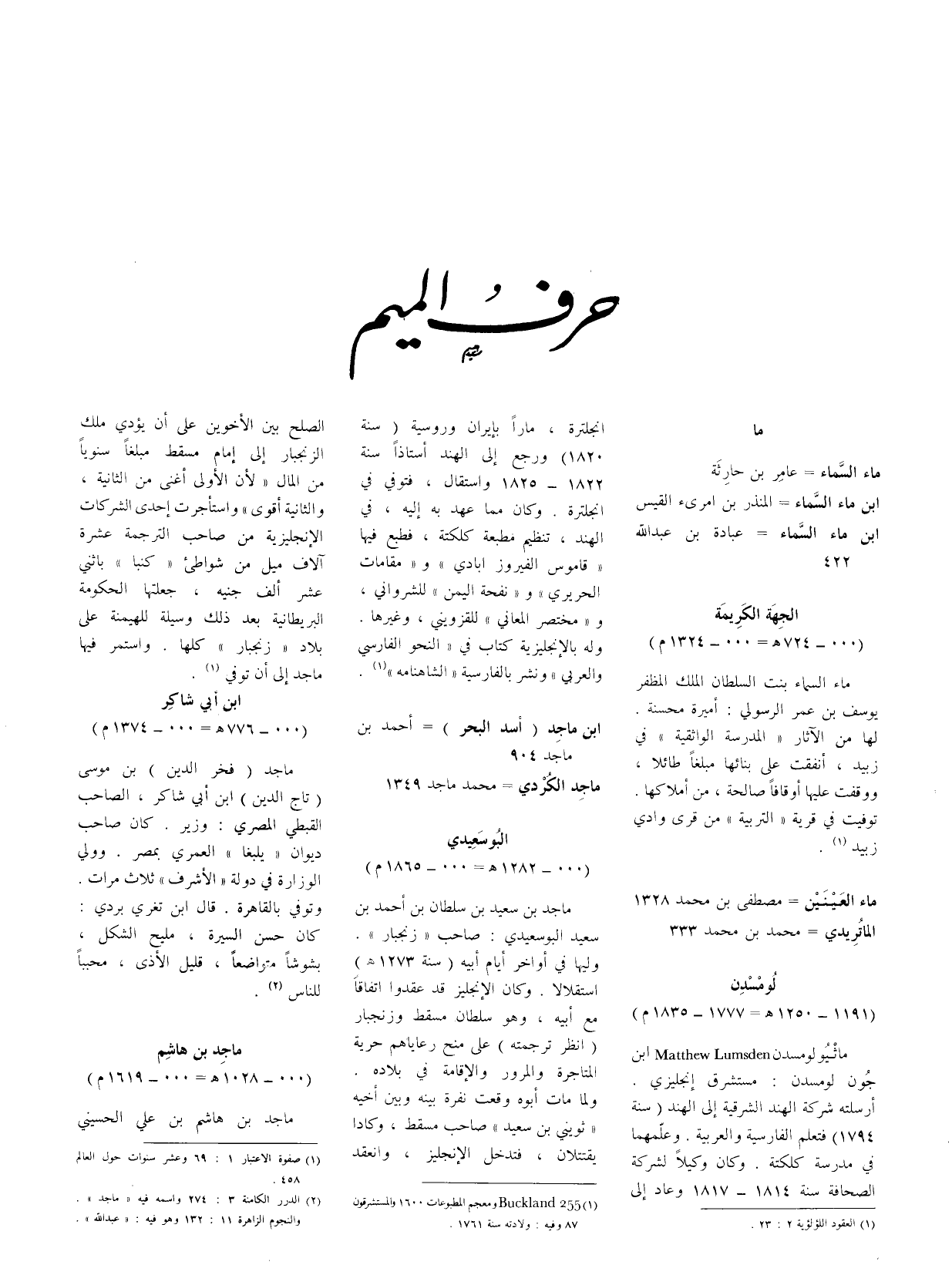 ماثيو لومسدن Matthew Lumsden ابن جون لومسدن: مستشرق إنجليزي. أرسلته شركة الهند الشرقية إلى الهند (سنة 1794) فتعلم الفارسية والعربية. وعلّمهما في مدرسة كلكتة. وكان وكيلا لشركة الصحافة سنة 1814 - 1817 وعاد إلى