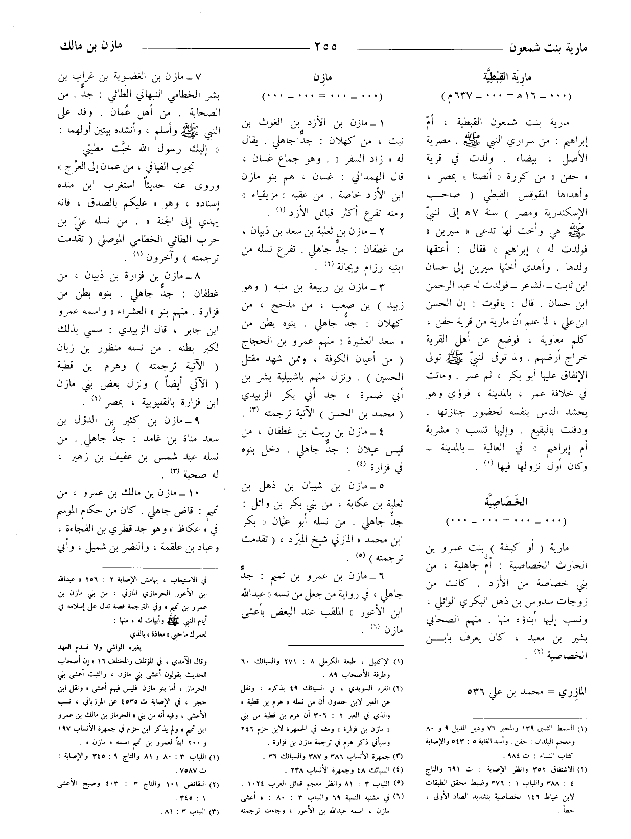 مارية بنت شمعون القبطية، أمّ إبراهيم: من سراري النبي صلى الله عليه وآله. مصرية الأصل، بيضاء. ولدت في قرية " حفن " من كورة " أنصنا " بمصر، وأهداها المقوقس القبطي (صاحب الإسكندرية ومصر) سنة 7هـ إلى النبي صلى الله عليه وآله هي وأخت لها تدعى " سيرين " فولدت له " إبراهيم " فقال: أعتقها ولدها. وأهدي أختها سيرين إلى حسّان ابن ثابت - الشاعر - فولدت له عبد الرحمن ابن حسان. قال: ياقوت: إن الحسن ابن علي، لما علم أن مارية من قرية حفن، كلم معاوية، فوضع عن أهل القرية خراج أرضهم. ولما توفي النبي صلّى الله عليه وآله وسلّم تولى الإنفاق عليها أبو بكر، ثم عمر. وماتت في خلافة عمر، بالمدينة، فرؤى وهو يحشد الناس بنفسه لحضور جنازتها. ودفنت بالبقيع. وإليها تنسب " مشربة أم إبراهيم " في العالية - بالمدينة - وكان أول نزولها فيها (1) .