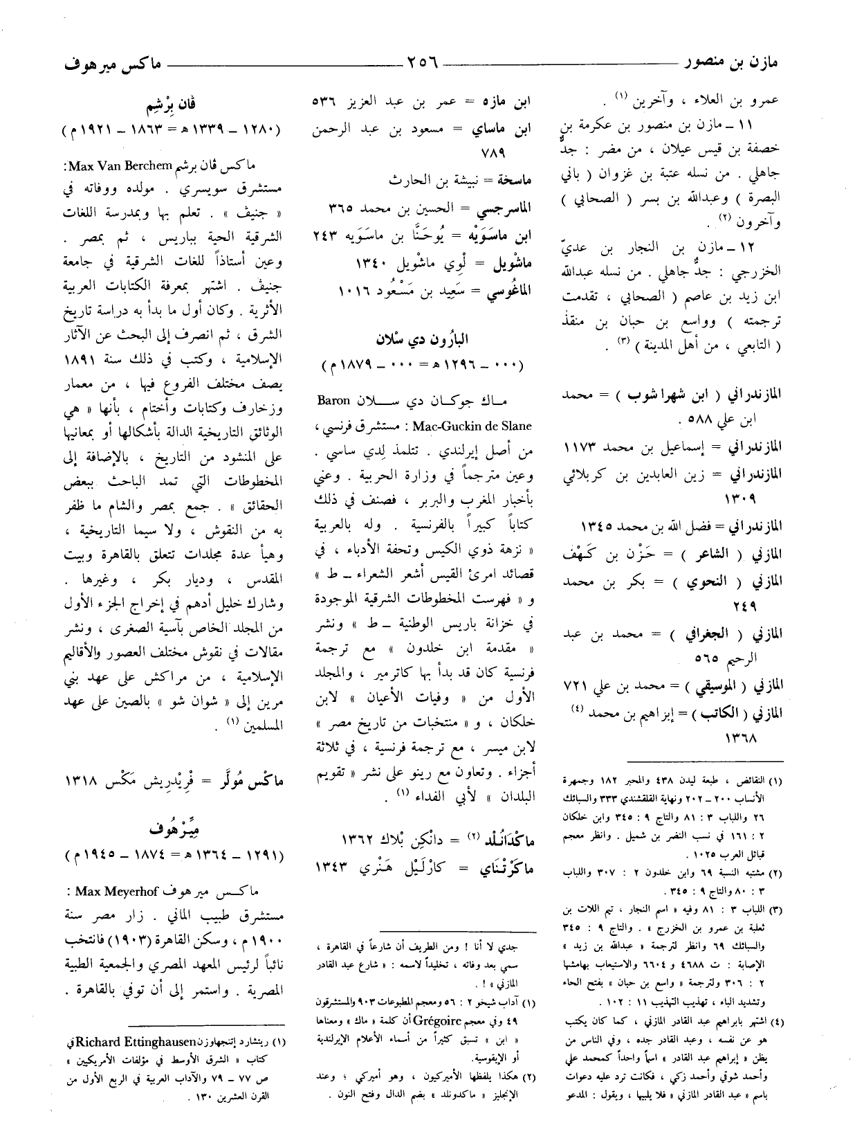 ماكس فان برشم: Max Avn Berchem مستشرق سويسري. مولده ووفاته في " جنيف ". تعلم بها وبمدرسة اللغات الشرقية الحية بباريس، ثم بمصر. وعين أستاذا للغات الشرقية في جامعة جنيف. اشتهر بمعرفة الكتابات العربية الأثرية. وكان أول ما بدأ به دراسة تاريخ الشرق، ثم انصرف إلى البحث عن الآثار الإسلامية، وكتب في ذلك سنة 1891 يصف مختلف الفروع فيها، من معمار وزخارف وكتابات وأختام، بأنها " هي الوثائق التاريخية الدالة بأشكالها أو بمعانيها على المنشود من التاريخ، بالإضافة إلى المخطوطات التي تمد الباحث ببعض الحقائق ". جمع تمد الباحث ببعض الحقائق ". جمع بمصر والشام ما ظفر به من النقوش، ولا سيما التاريخية، وهيأ عدة مجلدات تتعلق بالقاهرة وبيت، المقدس، وديار بكر، وغيرها. وشارك خليل أدهم في إخراج الجزء الأول من المجلد الخاص بآسية الصغري، ونشر مقالات في نقوش مختلف العصور والأقاليم الإسلامية، من مراكش على عهد بني مرين إلى " شوان شو " بالصين على عهد المسلمين (1) .