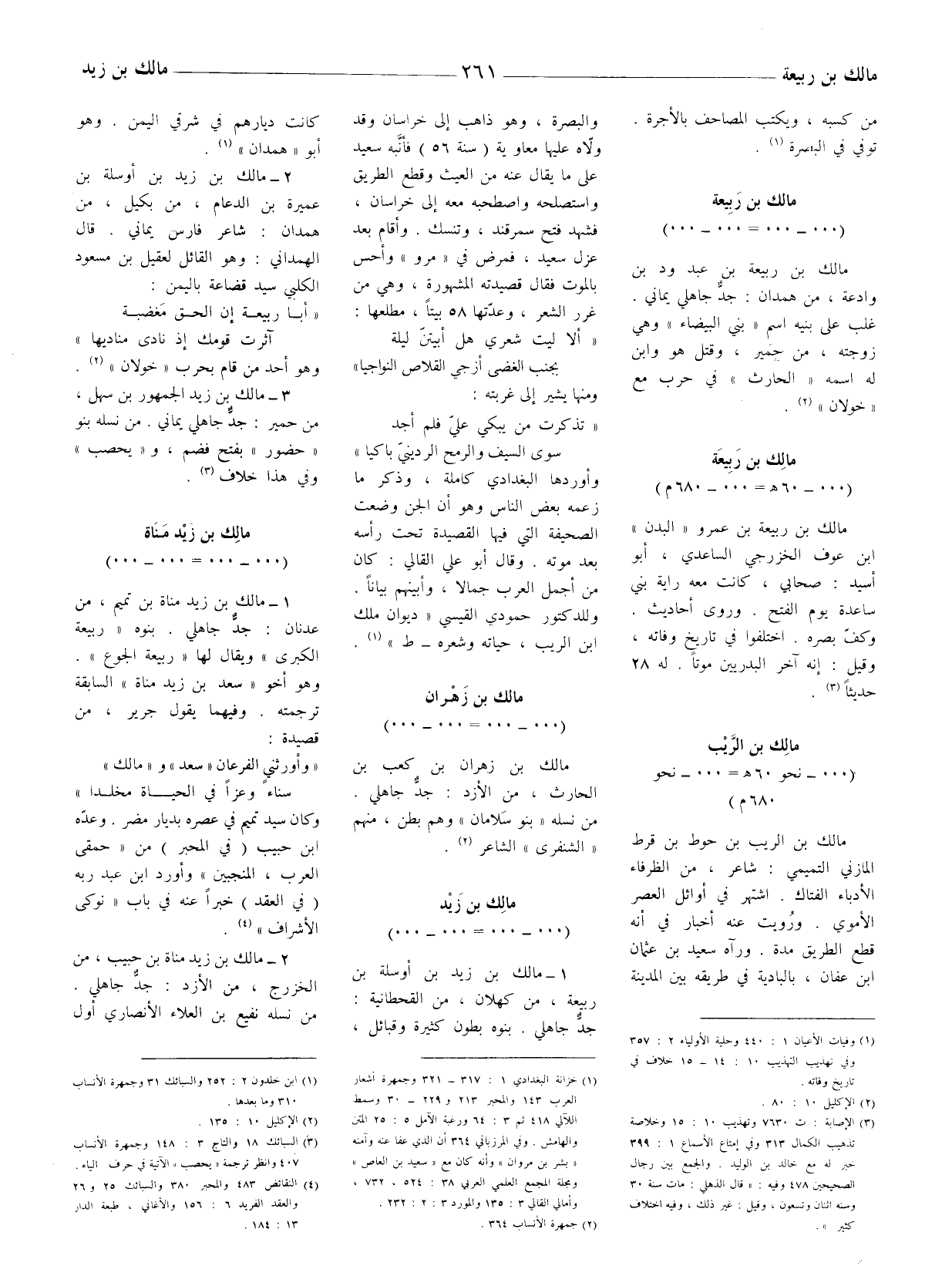 1 - مالك بن زيد مناة بن تميم، من عدنان: جدّ جاهلي. بنوه " ربيعة الكبري " ويقال لها " ربيعة الجوع ". وهو أخو " سعد بن زيد مناة " السابقة ترجمته. وفيهما يقول جرير، من قصيدة: " وأورثني الفرعان " سعد " و " مالك ". سناءاً وعزا في الحياة مخلدا " وكان سيد تميم في عصره بديار مضر. وعدَّه ابن حبيب (في المحبر) من " حمقى العرب، المنجبين " وأورد ابن عبد ربه (في العقد) خبرا عنه في باب " نوكى الأشراف " (4) .