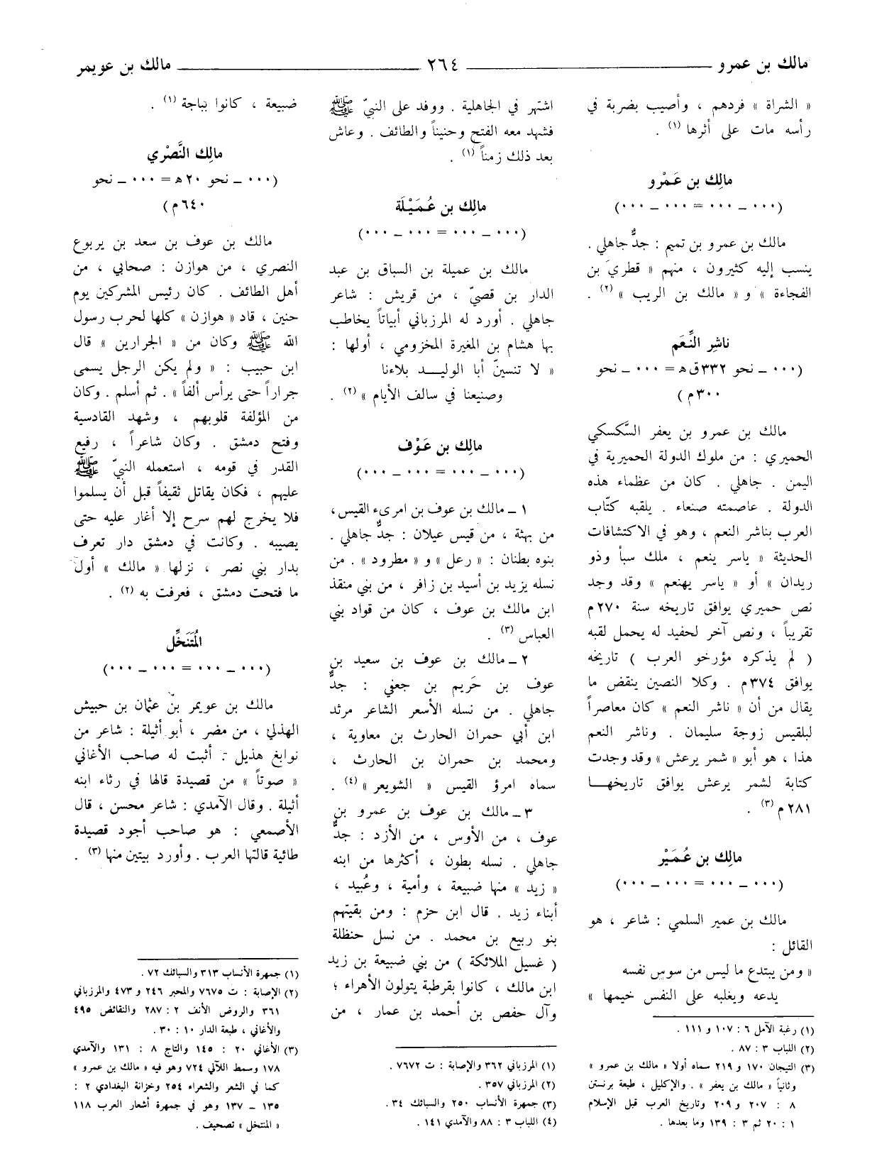(2) الإصابة: ت 7675 والمحبر 246 و 473 والمرزباني 361 والروض الأنف 2: 287 والنقائض 495 والأغاني، طبعة الدار 10: 30.