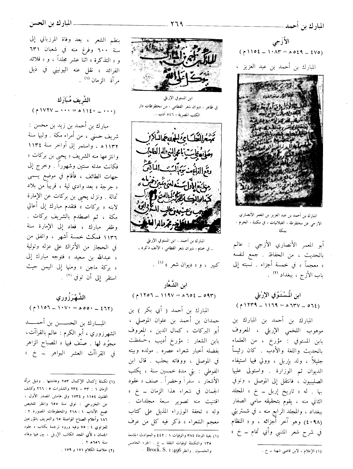 المبارك بن أحمد بن المبارك بن موهوب اللخمي الإِربلي، المعروف بابن المستوفي: مؤرخ، من العلماء بالحديث واللغة والأدب. كان رئيسا جليلا، ولد بإربل، وولي فيها استيفاء الديوان ثم الوزارة. واستولى عليها الصليبيون، فانتقل إلى الموصل، وتوفي بها. له " تاريخ إربل - خ " المجلد الثاني منه، يقوم بتحقيقه سامي الصفار ببغداد، والمجلد الرابع منه، في شستربتي (4098) وهو آخر أجزائه، و " النظام في شرح شعر المتنبي وأبي تمام - خ "