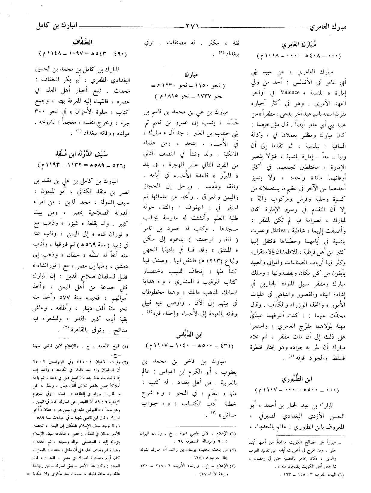 المبارك بن كامل بن محمد بن الحسين البغدادي الظفري، أبو بكر الخفاف: محدث. تتبع أخبار أهل العلم في عصره، فانتهت إليه المعرفة بهم، وجمع كتاب " سلوة الأحزان " في نحو 300 جزء وخرّج لنفسه " معجما " لشيوخه. مولده ووفاته ببغداد (1) .
