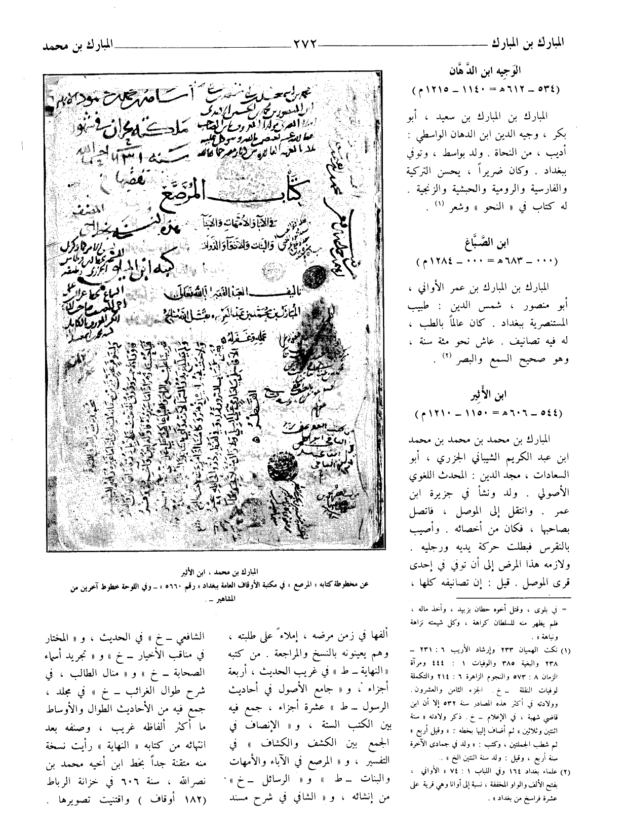 [[المبارك بن محمد، ابن الأثير عن مخطوطة كتابه " المرصع " في مكتبة الأوقاف العامة ببغداد " رقم 5660 " - وفي اللوحة خطوط آخرين من المشاهير -.]]