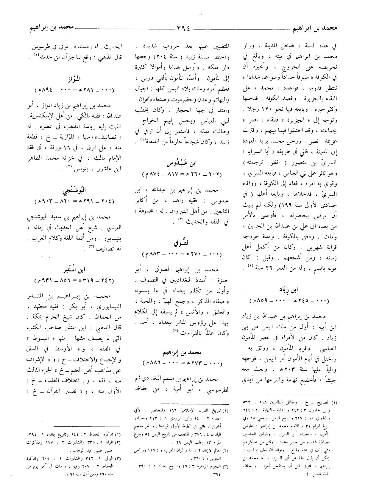 (1) المصابيح - خ. ومقاتل الطالبين 518 - 532 وابن خلدون 3: 242 والبداية والنهاية 10: 244 والطبري 10: 227 وتاريخ اليمن للواسعي 18 وفي بلوغ المرام 31 " الإمام محمد بن إبراهيم: عارض المأمون، وعضده أبو السرايا، وضايق العباسيين مضايقة شديدة على جسر بغداد، وقتل من عسكرهم مئتي ألف في عدة وقائع، وتوفاه الله تعالى " قلت: يمكن أن يقال هذا عن أبي السرايا، أما محمد بن إبراهيم، فتوفي قبل أن يستفحل أمره. وإتحاف المسترشدين 40.