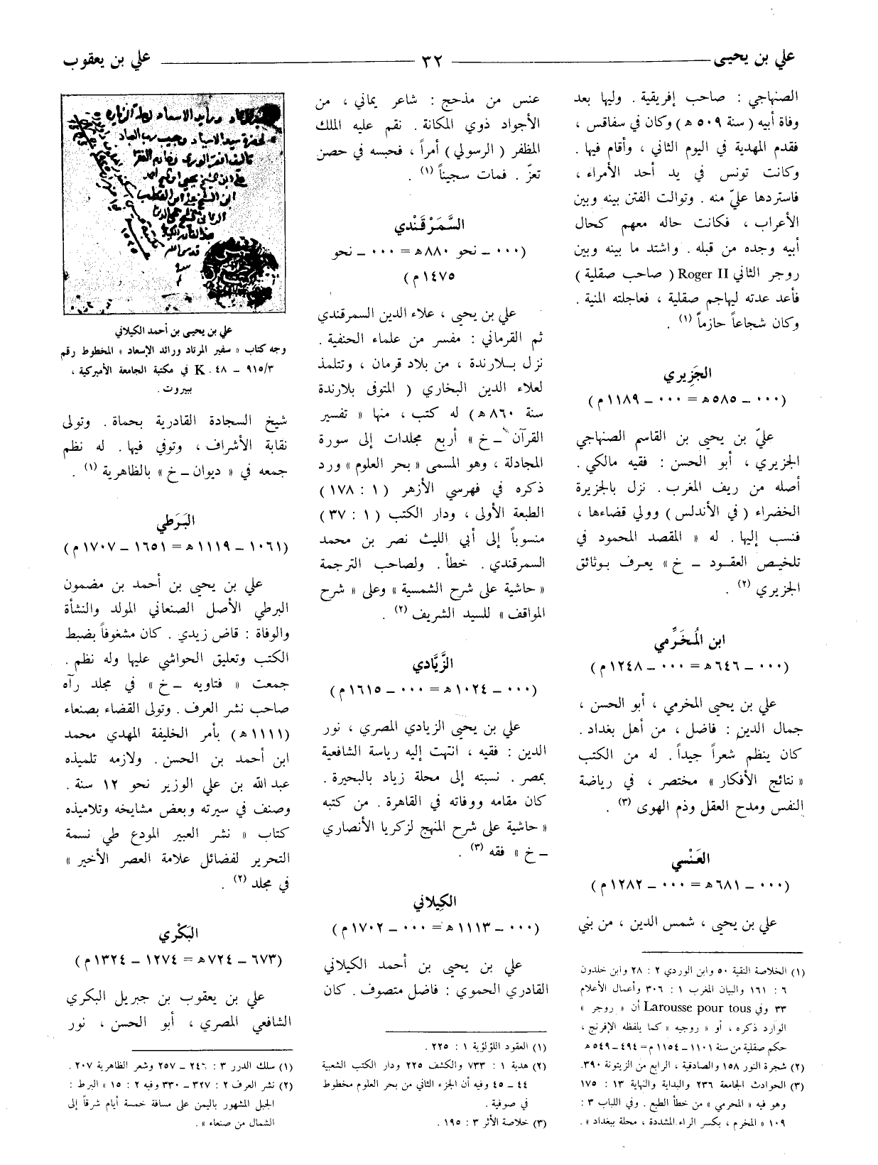 علي بن يحيى، علاء الدين السمرقندي ثم القرماني: مفسر من علماء الحنفية. نزل بلارندة، من بلاد قرمان، وتتلمذ لعلاء الدين البخاري (المتوفى بلارندة سنة 860 هـ له كتب، منها " تفسير القرآن - خ " أربع مجلدات إلى سورة المجادلة، وهو المسمى " بحر العلوم " ورد ذكره في فهرسي الأزهر (1: 178) الطبعة الأولى، ودار الكتب (1: 37) منسوبا إلى أبي الليث نَصٌر بن محمد السمرقندي. خطأ. ولصاحب الترجمة " حاشية على شرح الشمسية " وعلى " شرح المواقف " للسيد الشريف (2) .