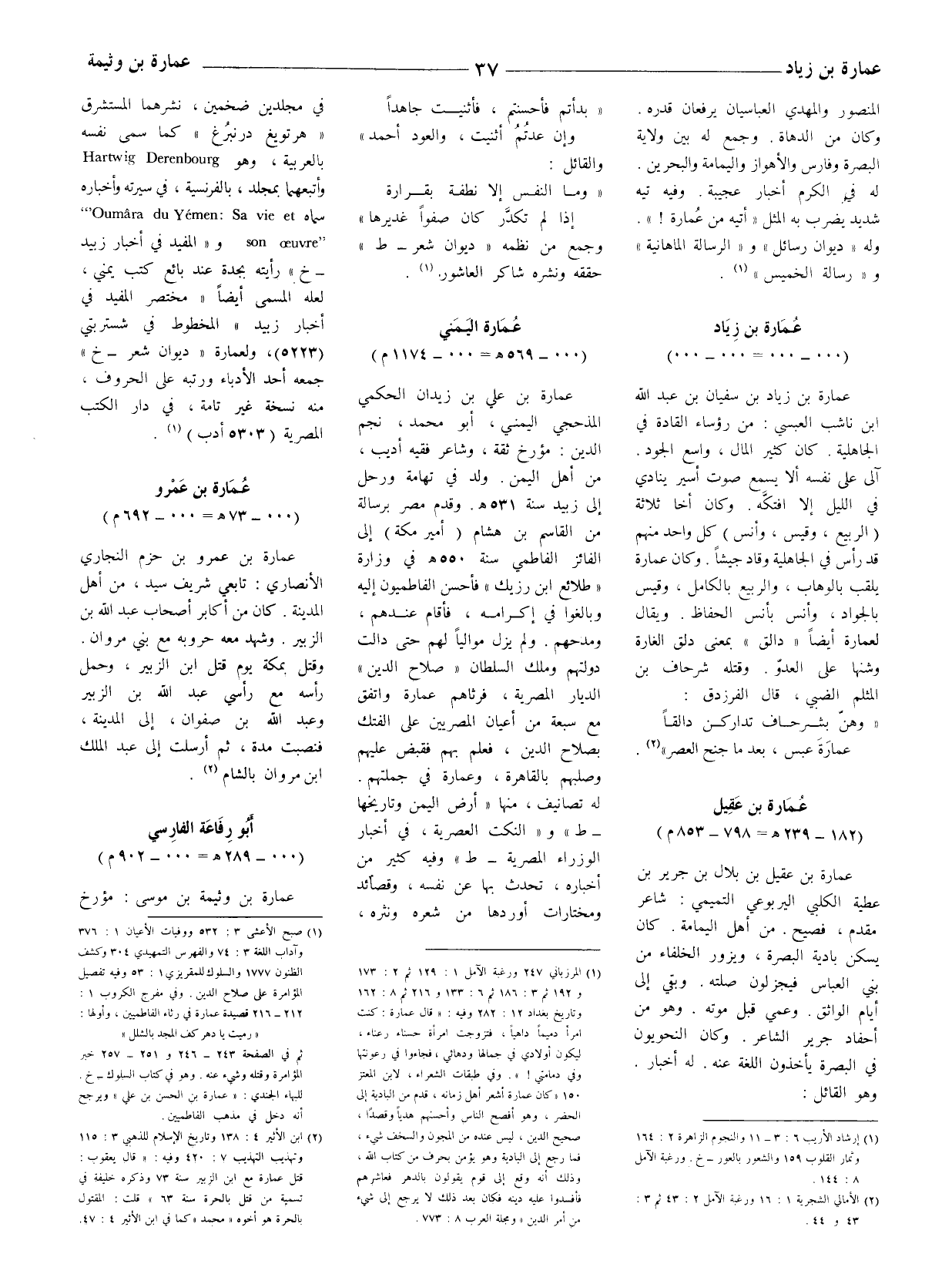 (1) المرزباني 247 ورغبة الآمل 1: 129 ثم 2: 173 و 192 ثم 3: 186 ثم 6: 133 و 216 ثم 8: 162 وتاريخ بغداد 12: 282 وفيه: " قال عمارة: كنت امرأ دميما داهيا، فتزوجت امرأة حسناء رعناء، ليكون أولادي في جمالها ودهائي، فجاءوا في رعونتها وفي دمامتي! ".