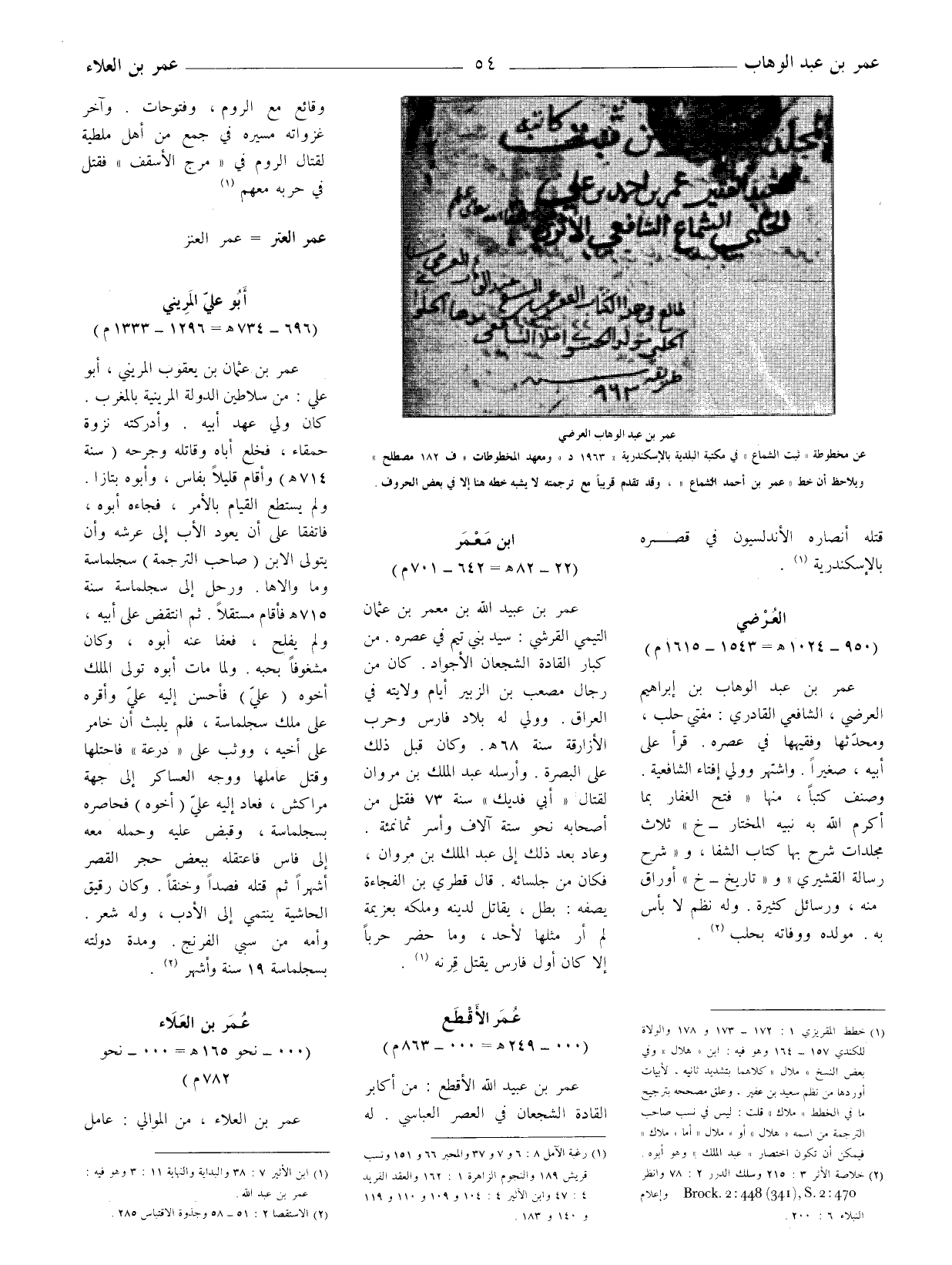 عمر بن عبد الوهاب بن إبراهيم العرضي، الشافعيّ القادري: مفتي حلب، ومحدّثها وفقيهها في عصره. قرأ على أبيه، صغيرواشتهر وولي إفتاء الشافعية. وصنف كتبا، منها " فتح الغفار بما أكرم الله به نبيه المختار - خ " ثلاث مجلدات شرج بها كتاب الشفا، و " شرح رسالة القشيري " و " تاريخ - خ " أوراق منه، ورسائل كثيرة. وله نظم لا بأس به. مولده ووفاته بحلب (1) .
