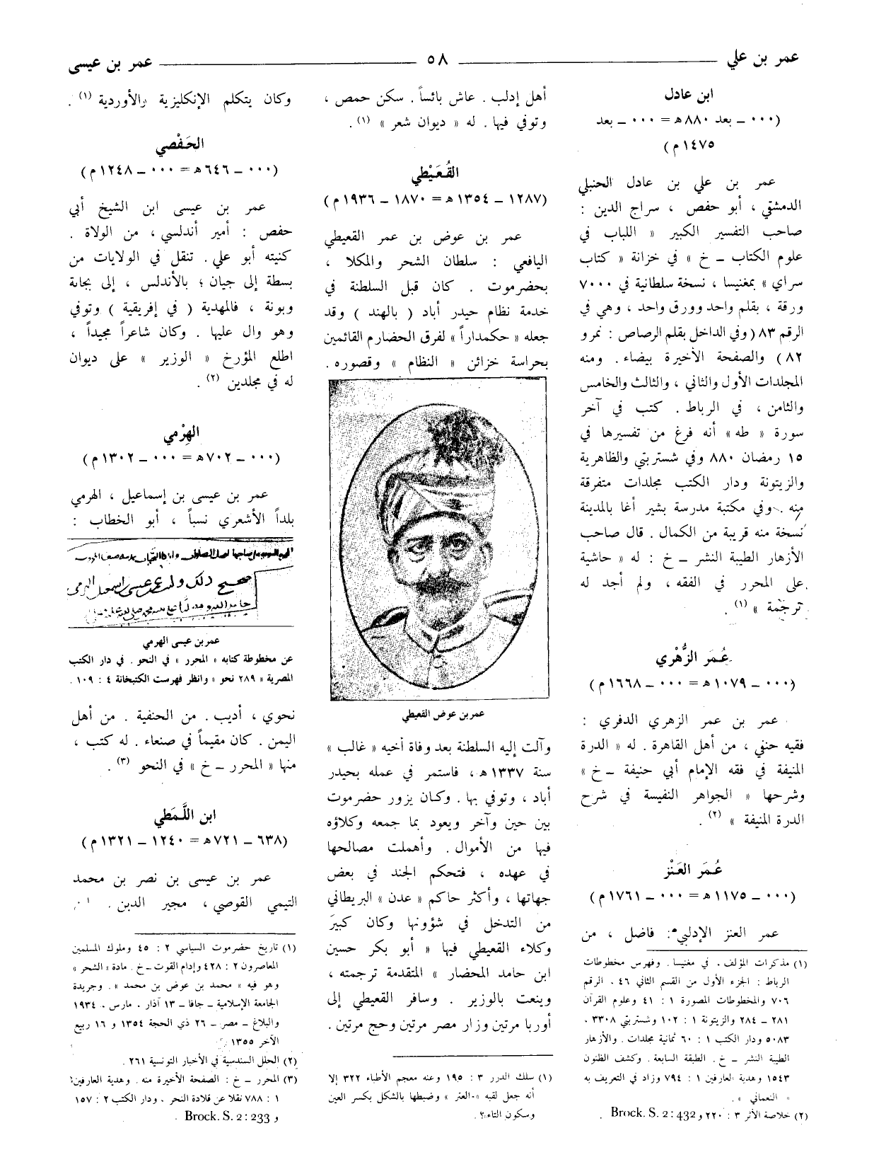 عمر بن علي بن عادل الحنبلي الدمشقيّ، أبو حفص، سراج الدين: صاحب التفسير الكبير " اللباب في علوم الكتاب - خ " في خزانة " كتاب سراي " بمغنيسا، نسخة سلطانية في 7000 ورقة، بقلم واحد وورق واحد، وهي في الرقم 83 (وفي الداخل بقلم الرصاص: نمرو 82) والصفحة الأخيرة بيضاء. ومنه المجلدات الأول والثاني، والثالث والخامس والثامن، في الرباط. كتب في آخر سورة " طه " أنه فرغ من تفسيرها في 15 رمضان 880 وفي شستربتي والظاهرية والزيتونة ودار الكتب مجلدات متفرقة منه. وفي مكتبة مدرسة بشير آغا بالمدينة نسخة منه قريبة من الكمال. قال صاحب الأزهار الطيبة النشر - خ: له " حاشية على المحرر في الفقه، ولم أجد له ترجمة " (1) .