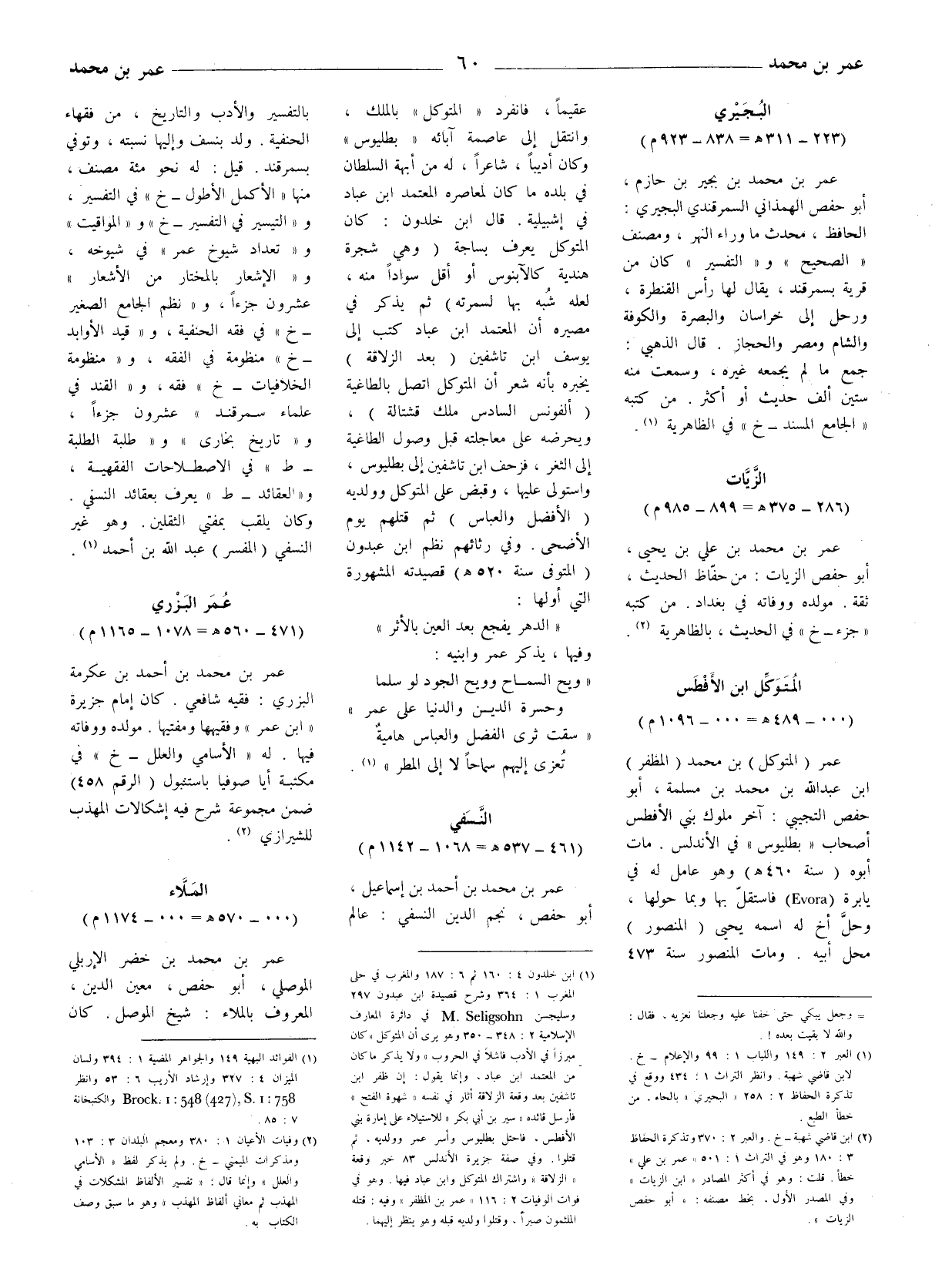 (2) ابن قاضي شهبة - خ. والعبر 2: 370 وتذكرة الحفاظ 3: 180 وهو في التراث 1: 501 " عمر بن علي " خطأ. قلت: وهو في أكثر المصادر " ابن الزيات " وفي المصدر الأول، بخط مصنفه: " أبو حفص الزيات ".