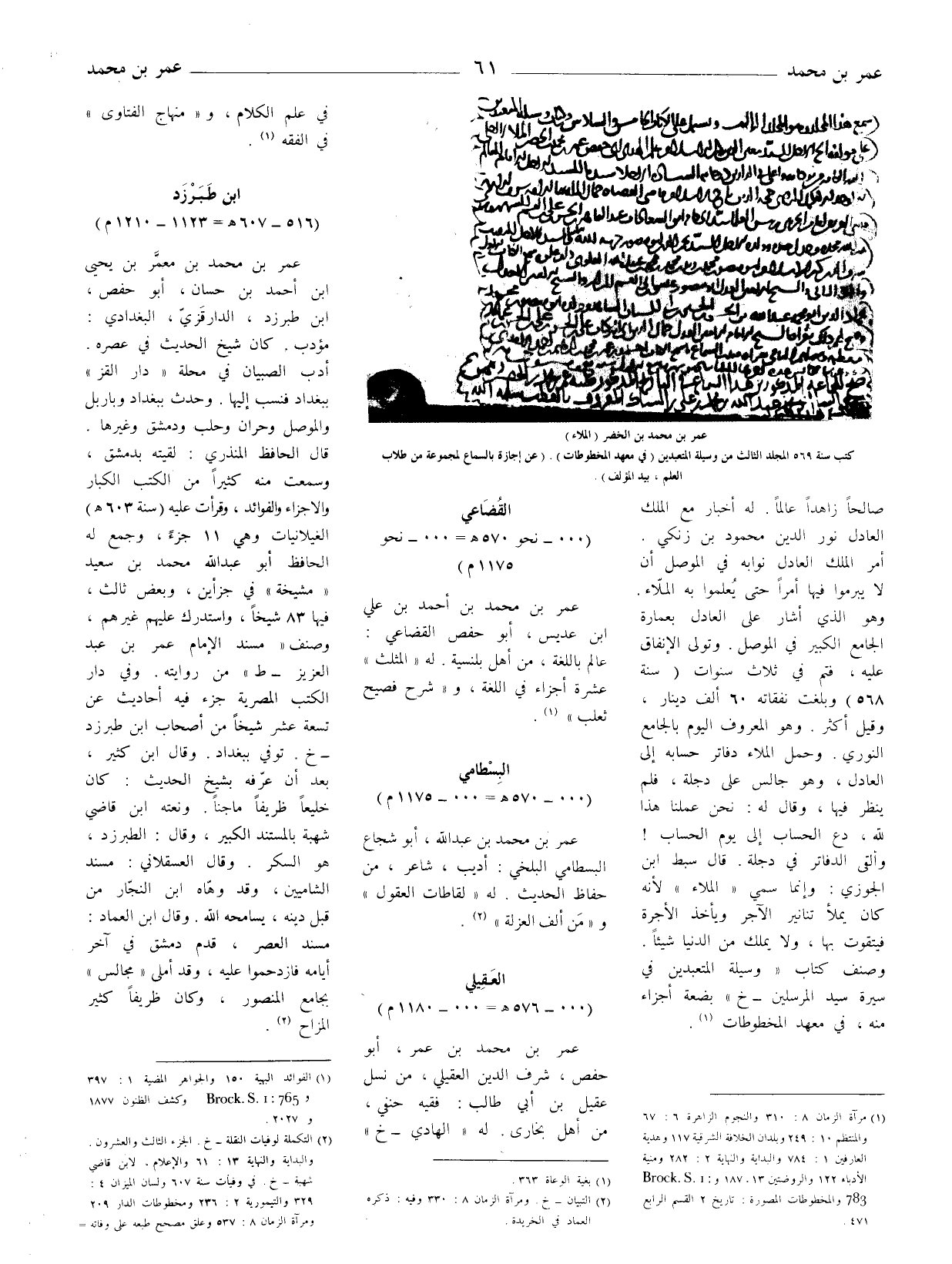 عمر بن محمد بن معمر بن يحيى ابن أحمد بن حسان، أبو حفص، ابن طبرزد، الدارقزي، البغدادي: مؤدب. كان شيخ الحديث في عصره. أدب الصبيان في محلة " دار القز " ببغداد فنسب إليها. وحدث ببغداد وبإربل والموصل وحران وحلب ودمشق وغيرها. قال الحافظ المنذري: لقيته بدمشق، وسمعت منه كثيرا من الكتب الكبار والاجزاء والفوائد، وقرأت عليه (سنة 603 هـ الغيلانيات وهي 11 جزء، وجمع له الحافظ أبو عبد الله محمد بن سعيد " مشيخة " في جزأين، وبعض ثالث، فيها 83 شيخا، واستدرك عليهم غيرهم، وصنف"مسند الإمام عمر بن عبد العزيز - ط " من روايته. وفي دار الكتب المصرية جزء فيه أحاديث عن تسعة عشر شيخا من أصحاب ابن طبرزد - خ. توفي ببغداد. وقال ابن كثير، بعد أن عرّفه بشيخ الحديث: كان خليعا ظريفا ماجنا. ونعته ابن قاضي شهبة بالمستند الكبير، وقال: الطبرزد، هو السكر.