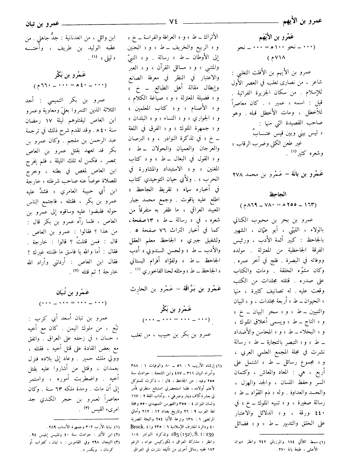عمرو بن بحر بن محبوب الكناني بالولاء، الليثي، أبو عثمان، الشهير بالجاحظ: كبير أئمة الأدب، ورئيس الفرقة الجاحظية من المعتزلة. مولده ووفاته في البصرة. فلج في آخر عمره. وكان مشوه الخلقة. ومات والكتاب على صدره. قتلته مجلدات من الكتب وقعت عليه. له تصانيف كثيرة، منها
