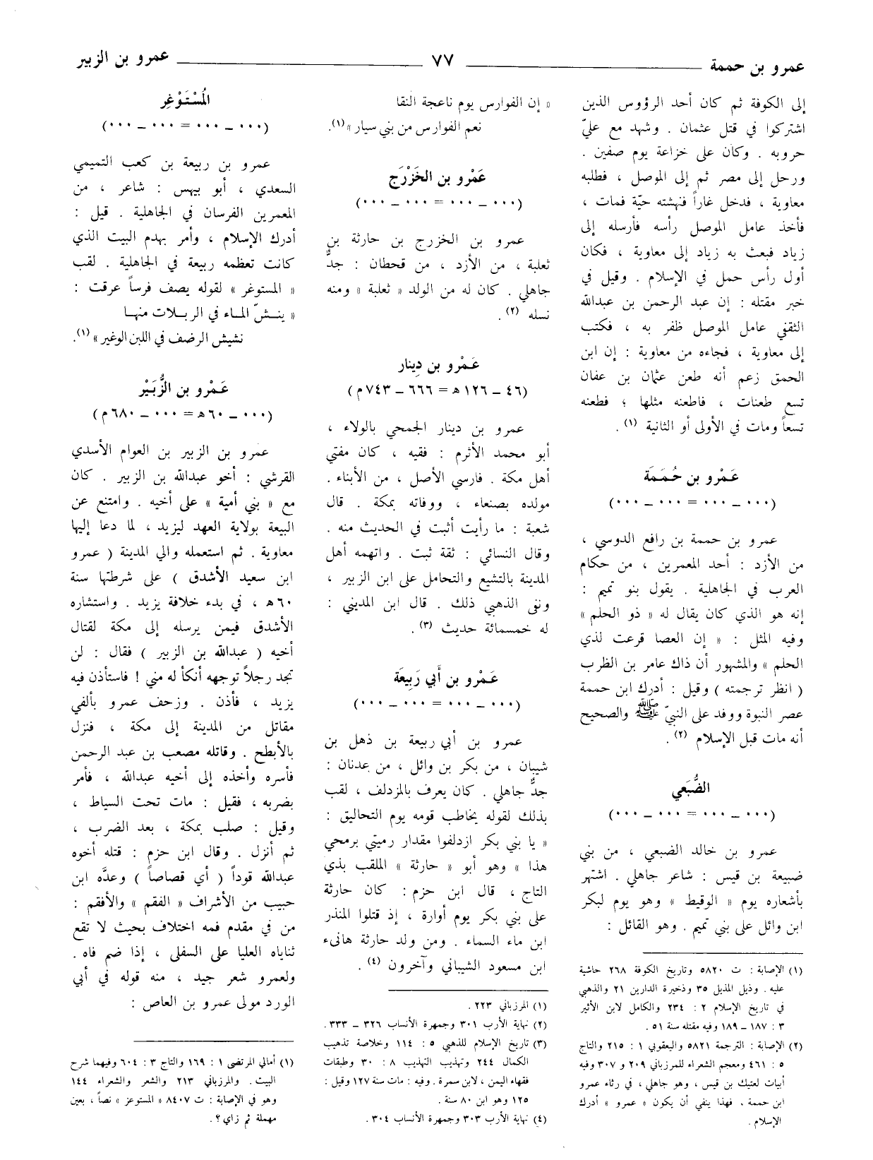 (2) الإصابة: الترجمة 5821 واليعقوبي 1: 215 والتاج 5: 461 ومعجم الشعراء للمرزباني 209 و 307 وفيه أبيات لعتيك بن قيس، وهو جاهلي، في رثاء عمرو ابن حممة، فهذا ينفي أن يكون " عمرو " أدرك الاسلام.