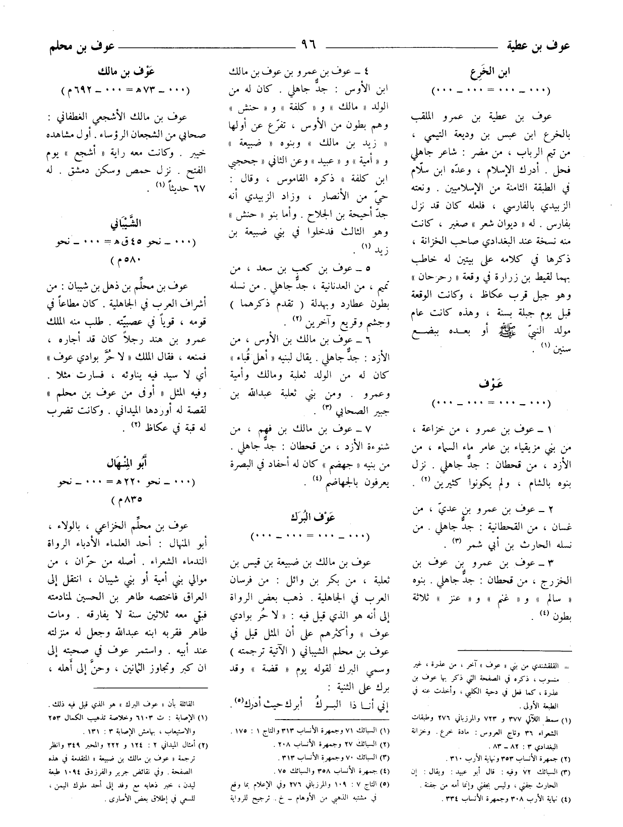 (2) أمثال الميداني 2: 124 و 222 والمحبر 349 وانظر ترجمة " عوف بن مالك بن ضبيعة " المتقدمة في هذه الصفحة. وفي نقائض جرير والفرزدق 1094 طبعة ليدن، خبر ذهابه مع وفد إلى أحد ملوك اليمن، للسعي في إطلاق بعض الأسارى.