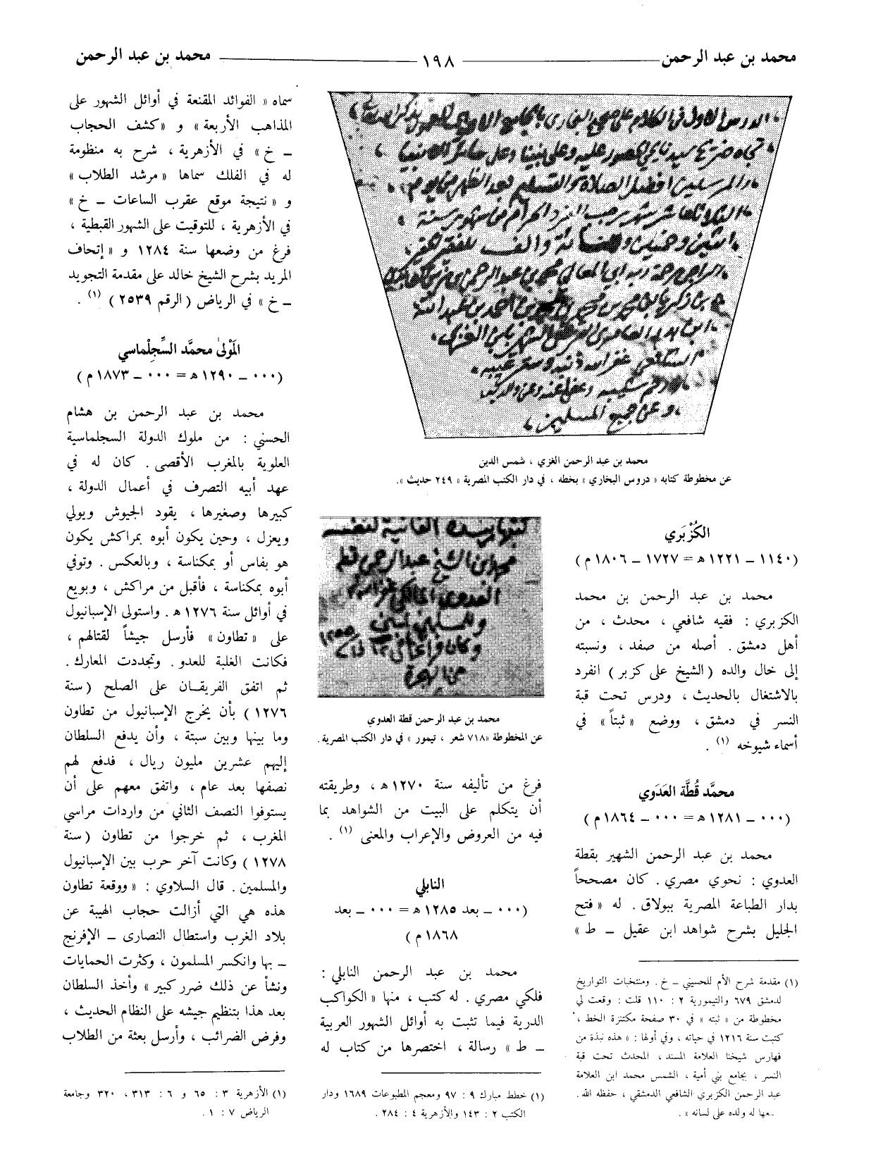 (1) مقدمة شرح الأم للحسيني - خ. ومنتخبات التواريخ لدمشق 679 والتيمورية 2: 110 قلت: وقعت لي مخطوطة من (ثبته) في 30 صفحة مكتنزة الخط، كتبت سنة 1216 في حياته، وفي أولها: (هذه نبذة من فهارس شيخنا العلامة المسند، المحدث تحت قبة النسر، بجامع بني أمية، الشمس محمد ابن العلامةعبد الرحمن الكزبري الشافعيّ الدمشقيّ، حفظه الله. جمعها له ولده على لسانه) .