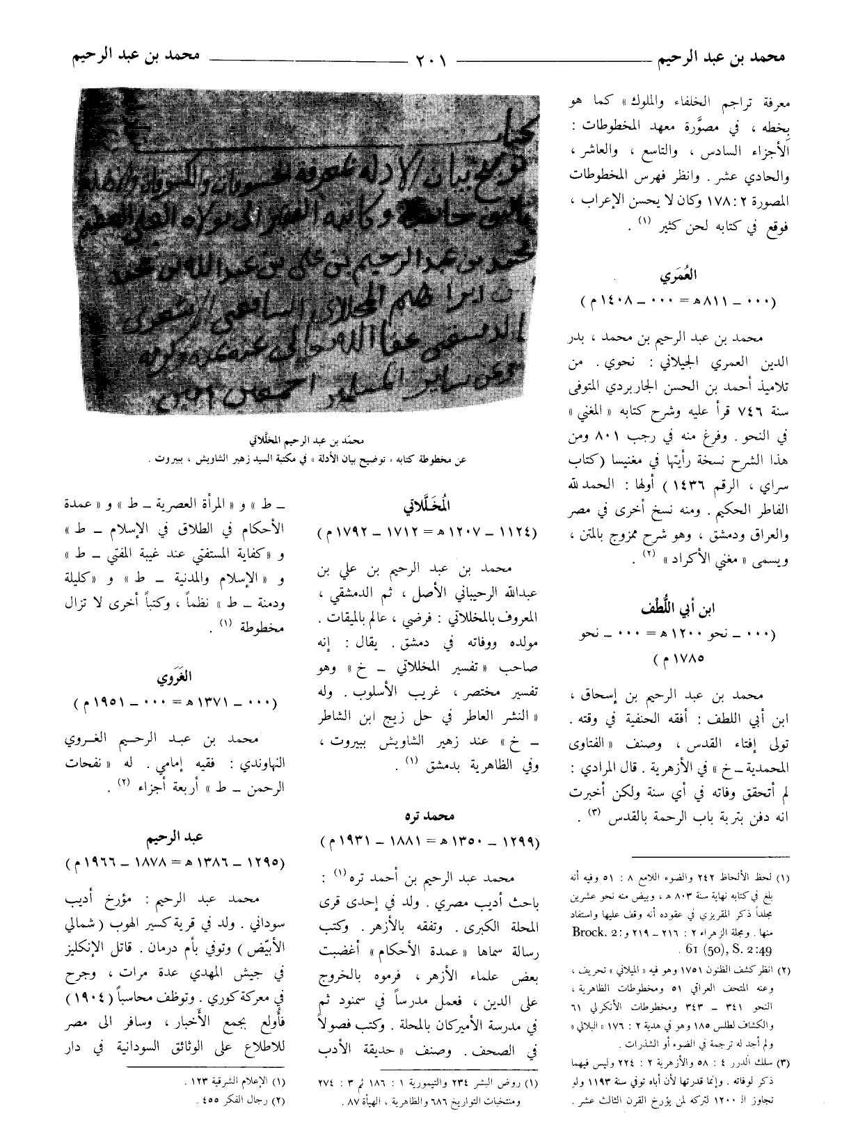 (3) سلك الدرر 4: 58 والأزهرية 2: 224 وليس فيهما ذكر لوفاته. وإنما قدرتها لأن أباه توفي سنة 1193 ولو تجاوز ال 1200 لتركه لمن يؤرخ القرن الثالث عشر.