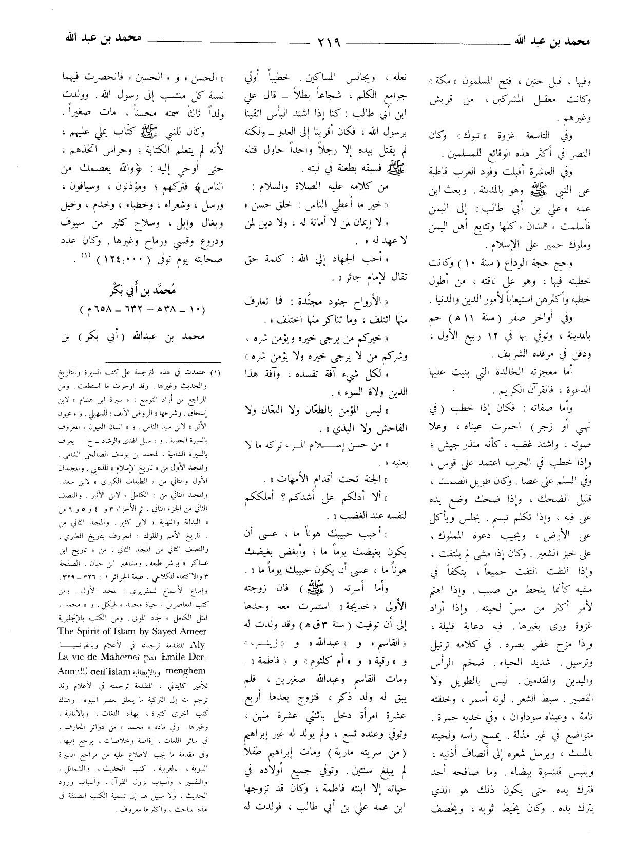 و (محمد، المثل الكامل) لجاد المولى. ومن الكتب بالانجليزية The Spirit Of Islam by Sayed Ammer Aly المتقدمة ترجمته في الأعلام وبالفرنسية - La vie de Mahomet par Emile Der menghem وبالايطالية Annalli dell ' Islam للامير كايتاني، المتقدمة ترجمته في الأعلام وقد ترجم منه إلى التركية ما يتعلق بعصر النبوة. وهناك كتب أخرى كثيرة، بهذه اللغات، وبالالمانية، وغيرها. وفي مادة (محمد) من دوائر المعارف، في سائر اللغات، إفاضة وخلاصات، يرجع إليها. وفي مقدمة ما يجب الاطلاع عليه من مراجع السيرة النبوية، بالعربية، كتب الحديث، والشمائل، والتفسير، وأسباب نزول القرآن، وأسباب ورود الحديث، ولا سبيل هنا إلى تسمية الكتب المصنفة في هذه المباحث، وأكثرها معروف.