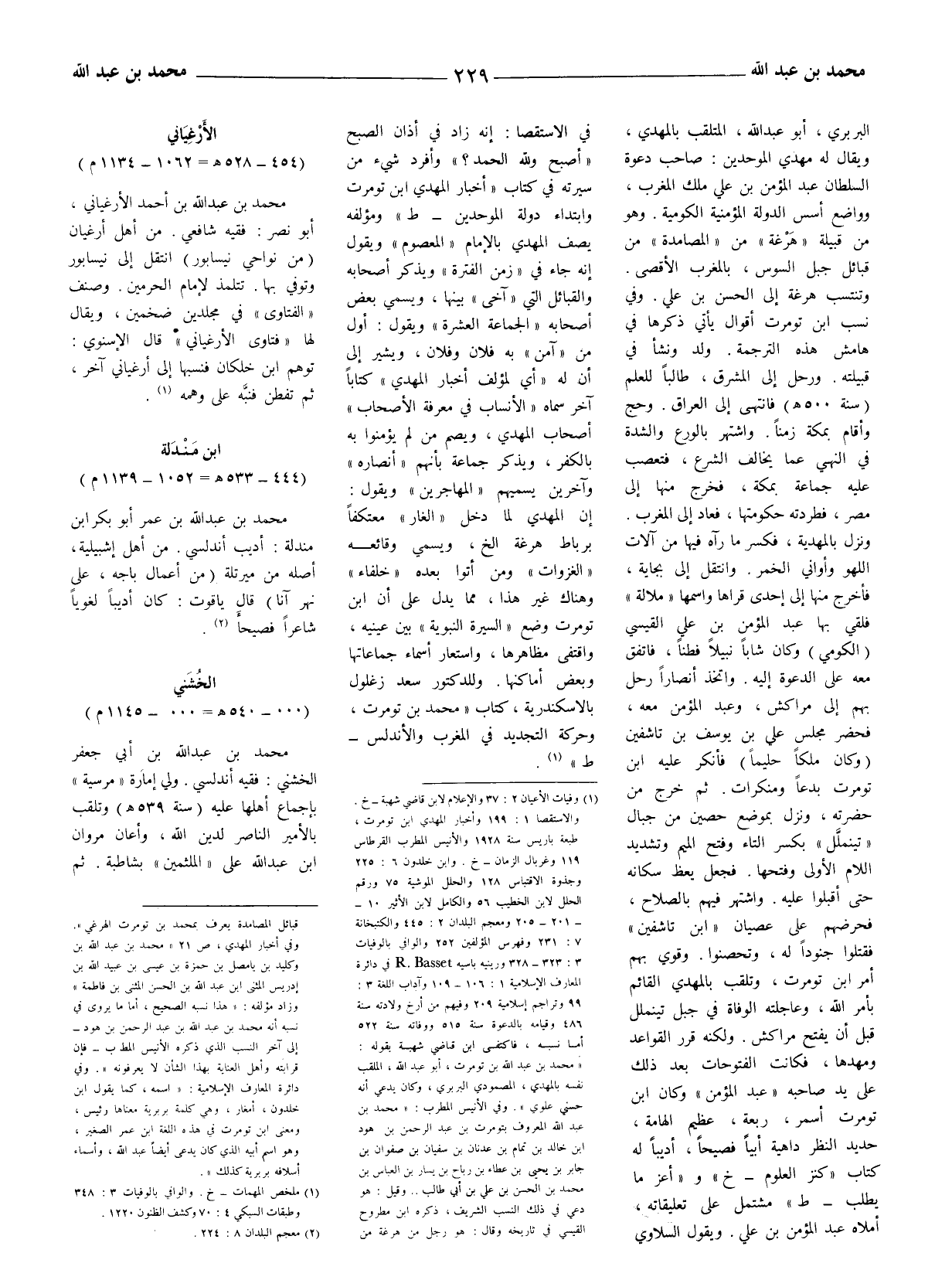 (1) وفيات الأعيان 2: 37 والإعلام لابن قاضي شهبة - خ. والاستقصا 1: 199 وأخبار المهدي ابن تومرت، طبعة باريس سنة 1928 والأنيس المطرب القرطاس 119 وغربال الزمان - خ. وابن خلدون 6: 225 وجذوة الاقتباس 128 والحلل الموشية 75 ورقم الحلل لابن الخطيب 56 والكامل لابن الأثير 10 - - 201 - 205 ومعجم البلدان 2: 445 والكتبخانة 7: 231 وفهرس المؤلفين 252 والوافي بالوفيات 3: 323 - 328 ورينيه باسيه. R Basset في دائرة المعارف الإسلامية 1: 106 - 109 وآداب اللغة 3: 99 وتراجم إسلامية 209 وفيهم من أرخ ولادته سنة 486 وقيامه بالدعوة سنة 515 ووفاته سنة 522 أما نسبه، فاكتفى ابن قاضي شهبة بقوله: (محمد بن عبد الله بن تومرت، أبو عبد الله، الملقب نفسه بالمهديّ، المصمودي البربري، وكان يدعي أنه حسني علوي) . وفي الأنيس المطرب: (محمد بن عبد الله المعروف بتومرت بن عبد الرحمن بن هود ابن خالد بن تمام بن عدنان بن سفيان بن صفوان بن جابر بن يحيى بن عطاء بن رباح بن يسار بن العباس بن محمد بن الحسن بن علي بن أبي طالب.