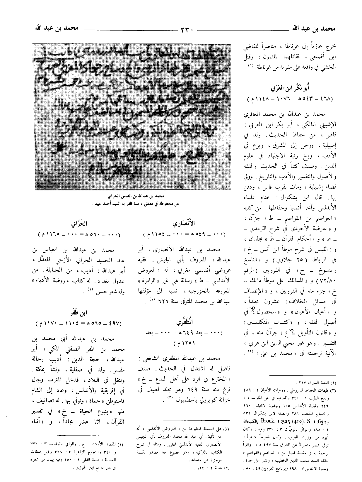 محمد بن عبد الله بن محمد المعافري الإشبيلي المالكي، أبو بكر ابن العربيّ: قاض، من حفاظ الحديث. ولد في إشبيلية، ورحل إلى المشرق، وبرع في الأدب، وبلغ رتبة الاجتهاد في علوم الدين. وصنف كتبا في الحديث والفقه والأصول والتفسير والأدب والتاريخ. وولي قضاء إشبيلية، ومات بقرب فاس، ودفن بها. قال ابن بشكوال: ختام علماء الأندلس وآخر أئمتها وحفاظها. من كتبه (العواصم من القواصم - ط) جزان، و (عارضة الأحوذي في شرح الترمذي - - ط) و (أحكام القرآن - ط) مجلدان، و (القبس في شرح موطأ ابن أنس - خ) في الرباط (25 جلاوي) و (الناسخ والمنسوخ - خ) في القرويين (الرقم 80 / 72) و (المسالك على موطأ مالك - خ) جزء منه في القرويين، و (الإنصاف في مسائل الخلاف) عشرون مجلدا، و (أعيان الأعيان) و (المحصول) في أصول الفقه، و (كتاب المتكلمين) و (قانون التأويل - خ) جزآن منه، في التفسير. وهو غير محيي الدين ابن عربي، الآتية ترجمته في (محمد بن علي) (2) .