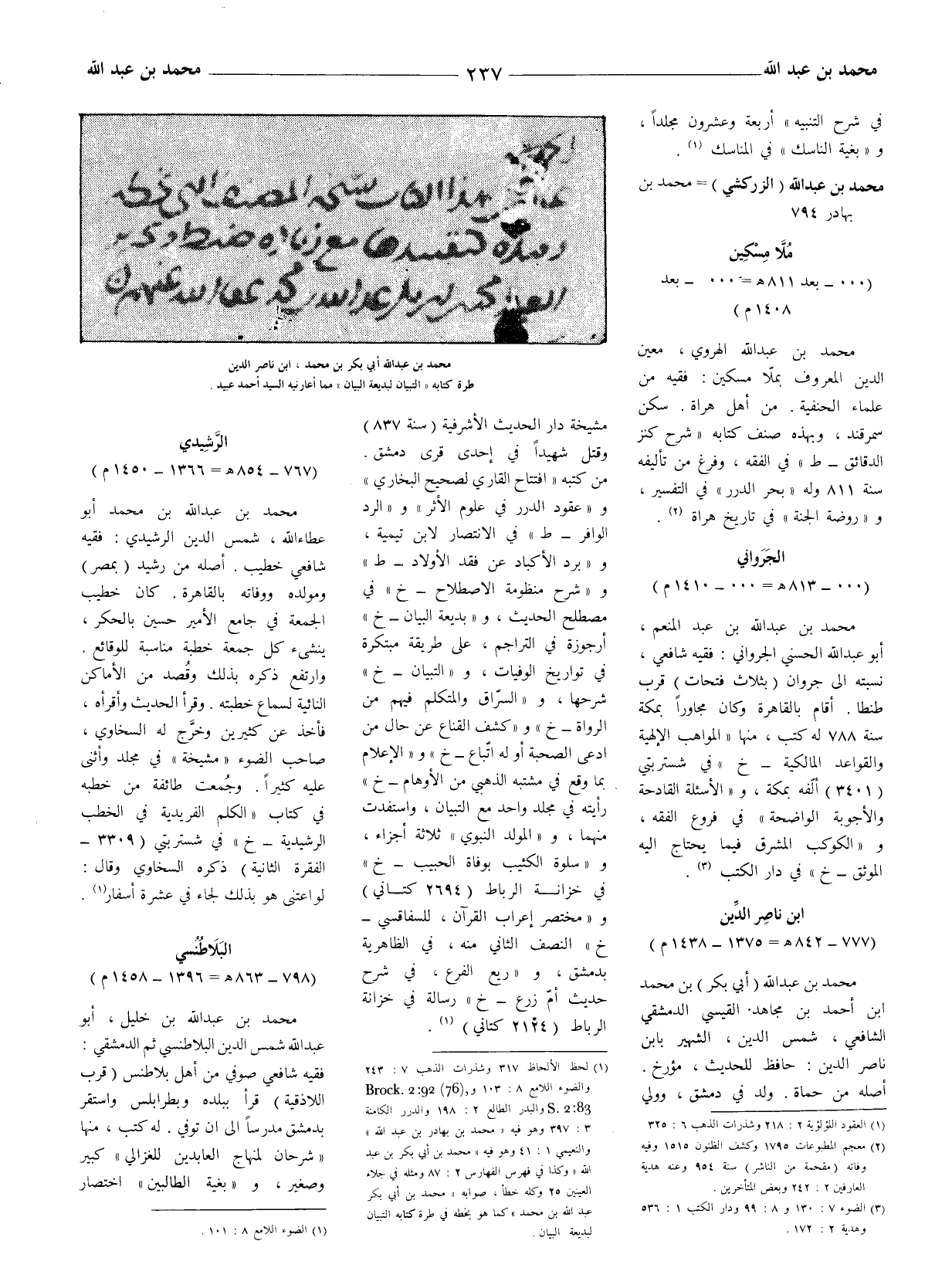 وBrock 2: 92 (79) S 2: 83 والبدر الطالع 2: 198 والدرر الكامنة 3: 397 وهو فيه (محَّمد بن بهادر بن عبد الله) والنعيمي 1: 41 وهو فيه (محَّمد بن أبي بكر بن عبد الله) وكذا في فهرس الفهارس 2: 87 ومثله في جلاء العينين 25 وكله خطأ، صوابه (محمد بن أبي بكر عبد الله بن محمد) كما هو بخطه في طرة كتابه التبيان لبديعة البيان.